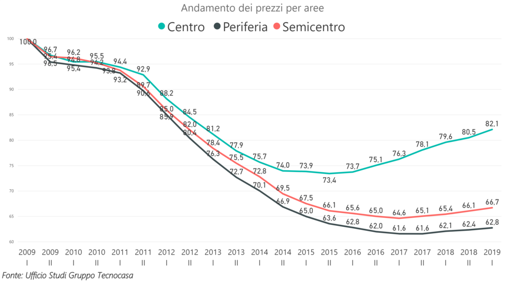 Il 2019 ha confermato i segnali di ripresa del mercato immobiliare. Dati visibili soprattutto nelle grandi città dove oltre all’aumento delle compravendite si registra anche un incremento dei prezzi. Le quotazioni delle grandi città italiane, nella prima parte del 2019, sono aumentate dello 0,9% e l’analisi dei prezzi fatta ha mostrato una performance decisamente migliore per le aree centrali (+2,0%), seguite da quelle semicentrali (+1,0%) ed infine da quelle periferiche (+0,6%). In alcune realtà in cui la ripresa è stata particolarmente vivace nelle zone centrali, c’è stato uno spostamento della domanda nelle aree più periferiche e semicentrali.