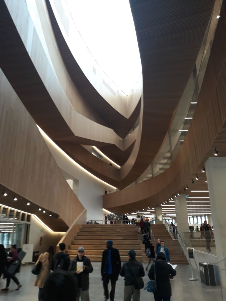 Una facciata dinamica a tripli vetri composta da un modello modulare esagonale e da un ampio arco rivestito con legno di cedro rosso occidentale proveniente dalla vicina Columbia Britannica: dall’aggregazione degli esagoni emergono forme che richiamano alla mente quelle di un libro aperto o di un fiocco di neve, una sorta di vocabolario visivo che continua all’interno dell’edificio, dove si possono ammirare robuste doghe in legno che salgono a spirale fino a 30 metri di altezza, delimitando il perimetro dell’atrio aperto a forma di ellisse.