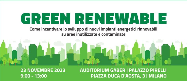 Regione Lombardia, Audis, Assolombarda, Confindustria Lombardia presentano il convegno Green Renewable di best practice per nuovi impianti energetici rinnovabili su aree inutilizzate. L’appuntamento è giovedì 23 novembre, dalle 9 alle 13, a Milano, Auditorium Gaber di Palazzo Pirelli.