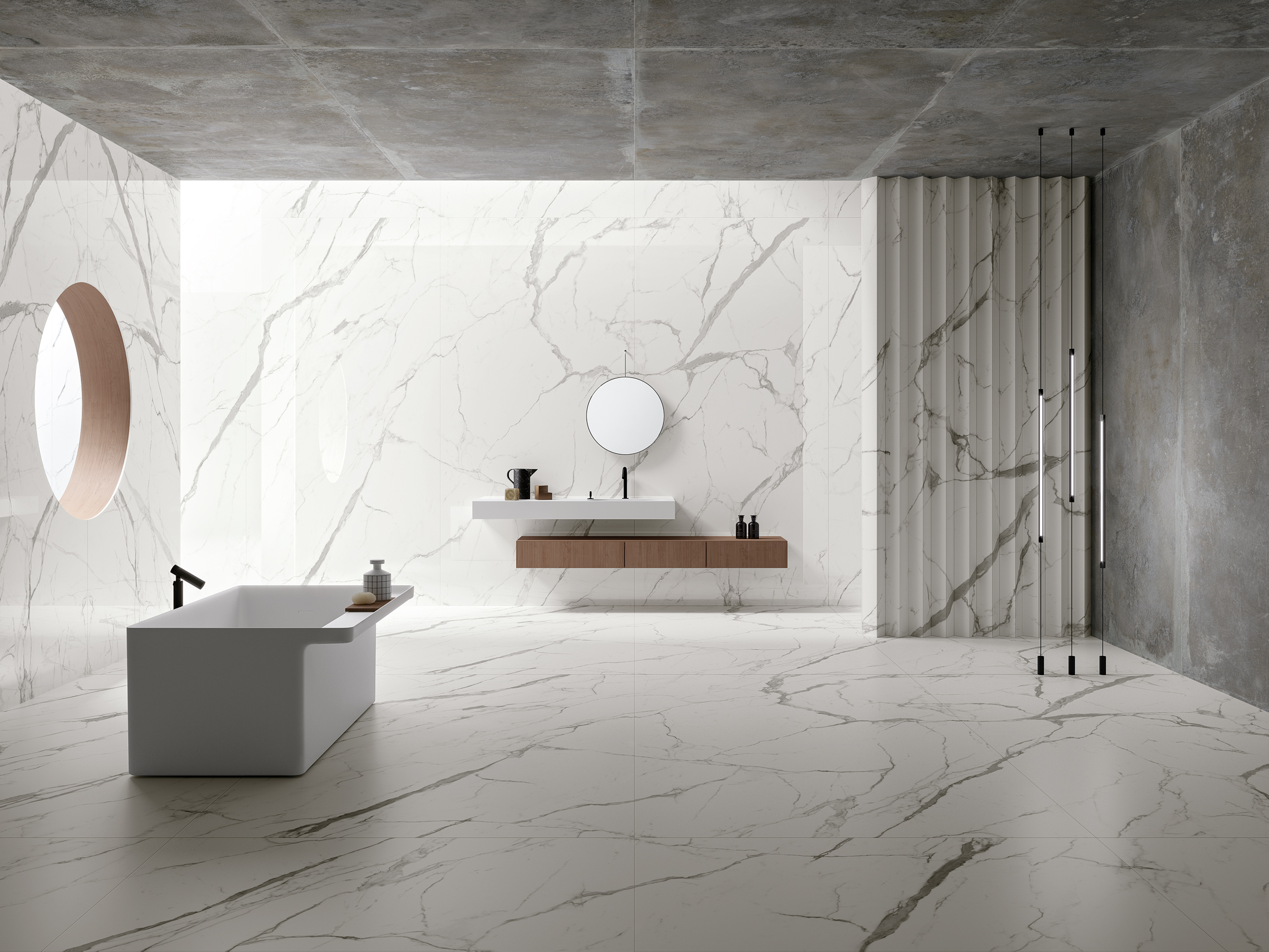 Capace di abbracciare le esigenze di ogni stile architettonico e destinazione d’uso, Bianco Statuario di Ariostea permette anche la possibilità di rispondere a specifiche esigenze progettuali quali la creazione di top cucina, lavabi, quinte, tavoli, ante ed arredi custom-made.