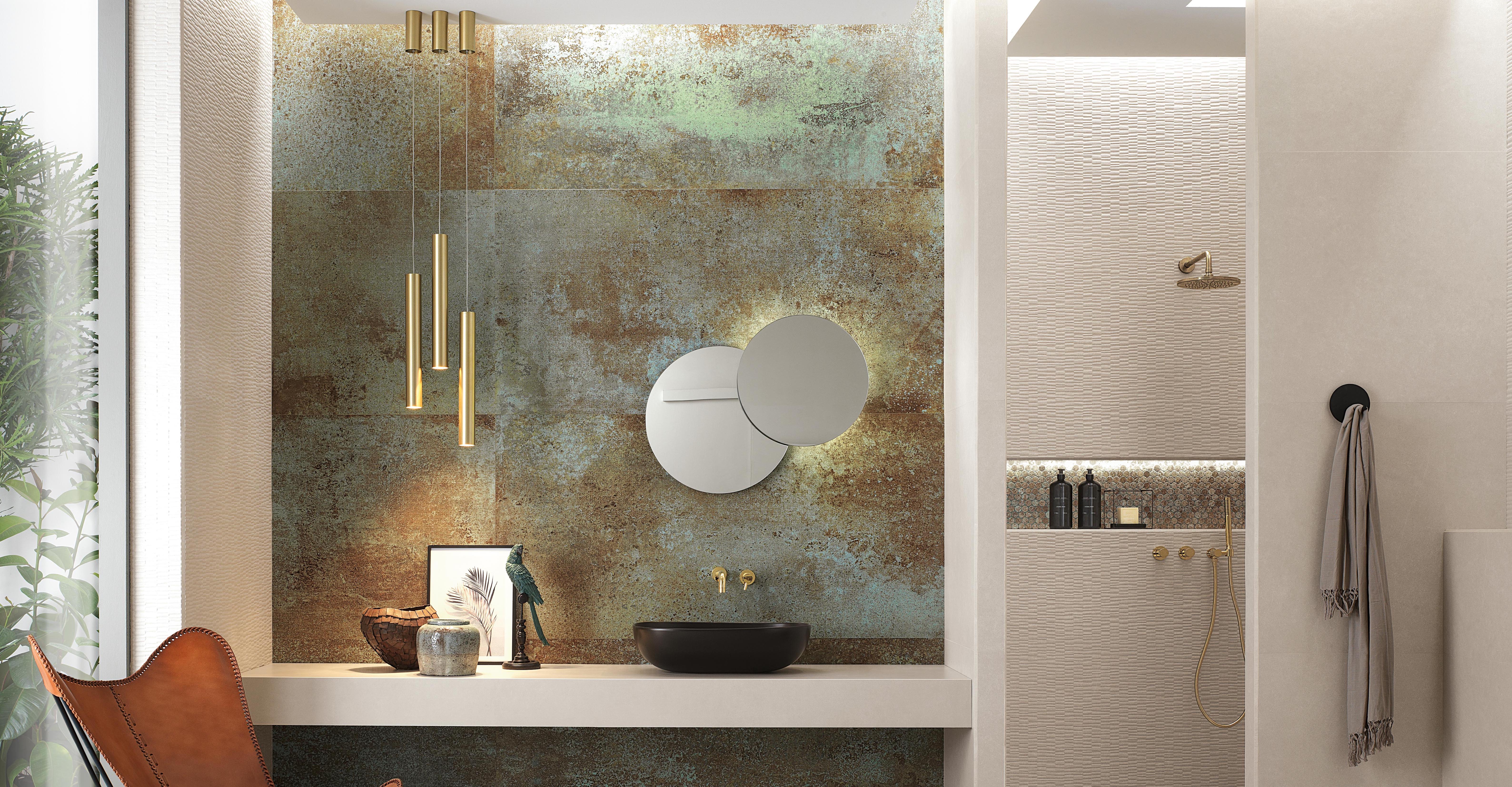 Grazie alle lavorazioni realizzate dall’azienda le estetiche di Sheer danno ritmo agli ambienti con accenti naturali, rilievi 3D e inserti metallici. Ne sono una testimonianza Camou Beige e Grey – ispirati alla matericità delle cave di marmo – e la bellezza dell’effetto ruggine Deco Rust.