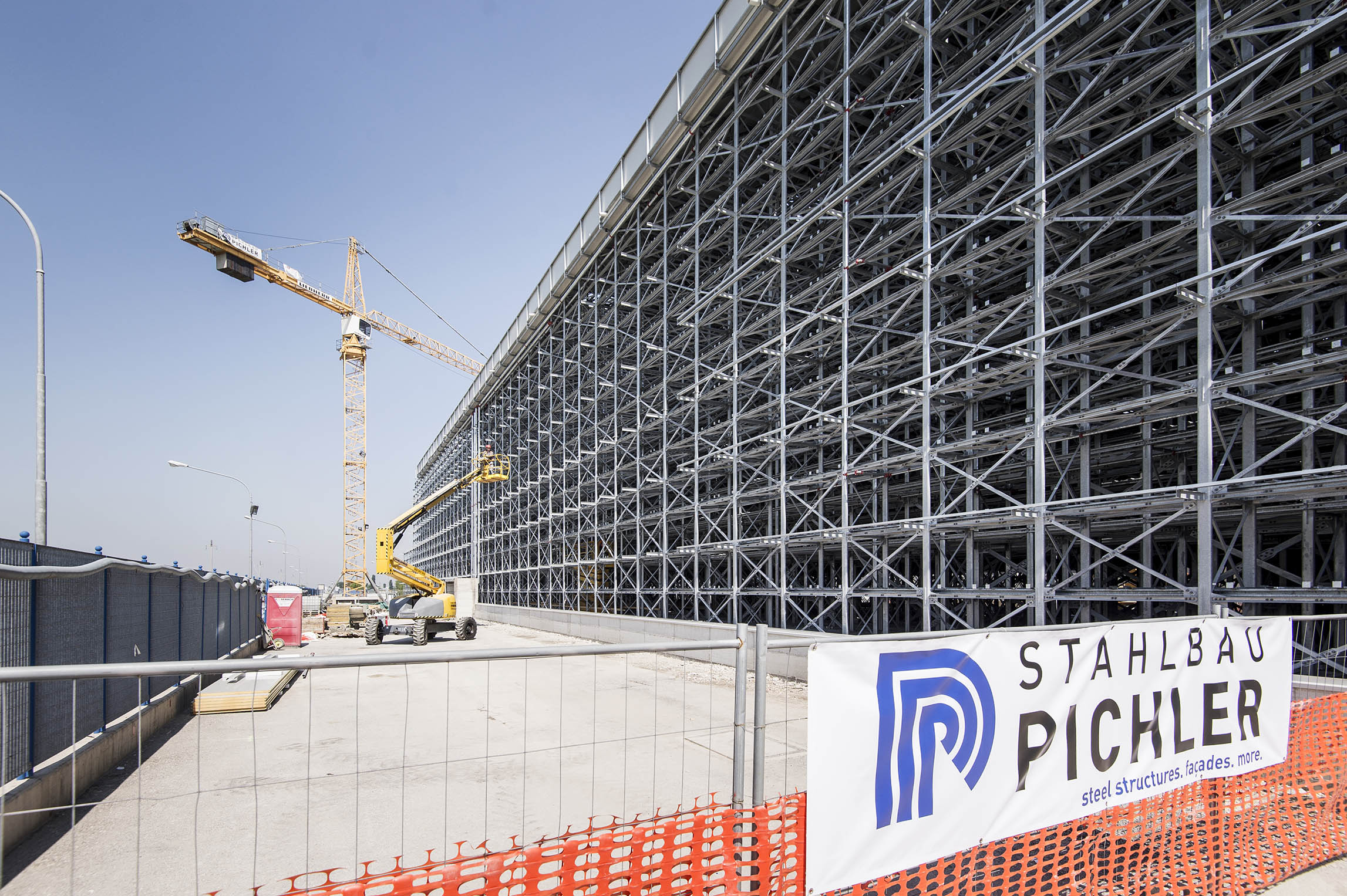 Dal punto di vista dell’organizzazione del cantiere, il progetto è da considerarsi particolare. Il committente aveva infatti necessità di un’ultimazione del cantiere in tempi brevissimi e disponeva di un areale molto stretto. Stahlbau Pichler, già in fase di progettazione, aveva individuato la necessità di un mezzo di sollevamento particolare.