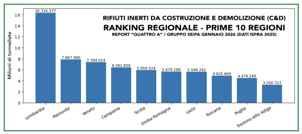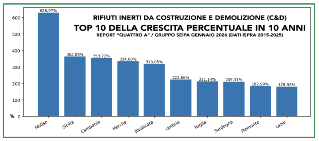 In dieci anni i rifiuti inerti da costruzione e demolizione crescono del 65% in Italia. La Lombardia resta la prima regione per volumi prodotti, mentre il Molise registra l’aumento percentuale più alto. I dati Quattro A del Gruppo Seipa evidenziano nuove sfide e opportunità per l’economia circolare.