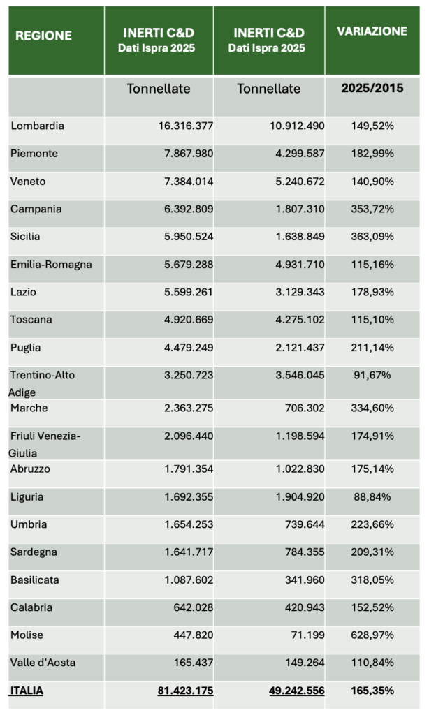 Accanto ai grandi bacini storici, l’analisi mette in luce forti squilibri nelle dinamiche di crescita. Il Molise registra l’incremento percentuale più elevato a livello nazionale (+628,97%), pur partendo da quantitativi contenuti. Crescite superiori al triplo si osservano anche in Sicilia (+363,09%), Campania (+353,72%), Marche (+334,60%) e Basilicata (+318,05%), segnale di una rapida intensificazione delle attività edilizie e infrastrutturali in territori finora marginali.