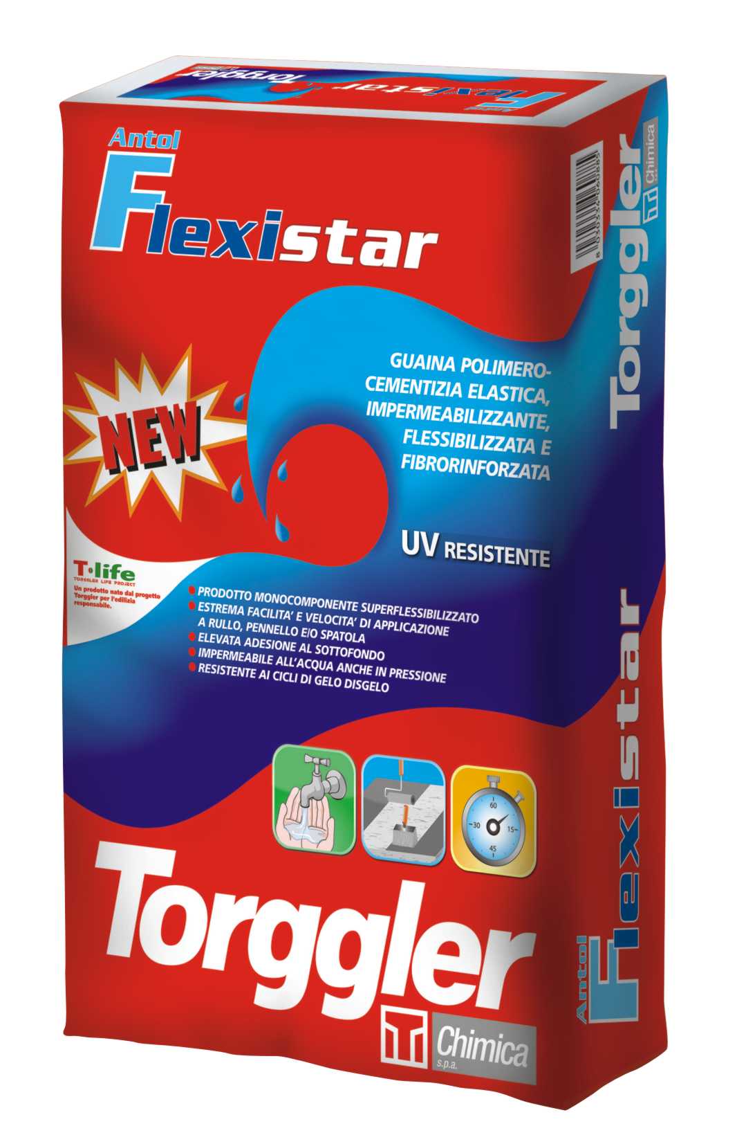 Antol Flexistar, monocomponenete superflessibilizzato, è anche UV resistente, ha un’ottima adesione al sottofondo e un’ottima capacità di sormonto sulle fessurazioni, è impermeabile all’acqua anche in pressione e resiste ai cicli di gelo e disgelo. Ancora una volta Torggler si rivolge al mercato con un prodotto cementizio integrato nel progetto “T-Life Project“ che si pone quale nuovo punto di riferimento nel settore dell’impermeabilizzazione, stabilendo nuovi valori e parametri tecnici di riferimento ottimizzando gli aspetti prestazionali del prodotto e il lavoro del posatore, nonché in generale la qualità di vita.