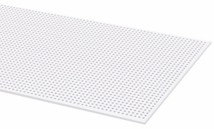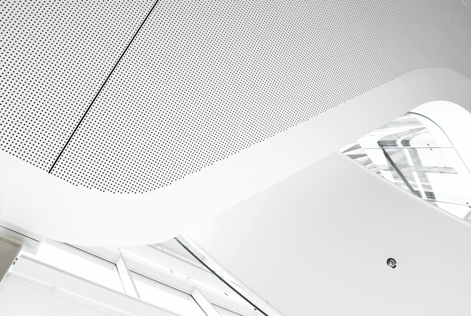 Le lastre in gesso rivestito Rigitone Active Air di Saint-Gobain Gyproc, grazie a foratura continua regolare quadrata, permettono di realizzare controsoffitti di tipo continuo con elevate prestazioni acustiche e assecondando le forme volute dal progetto.