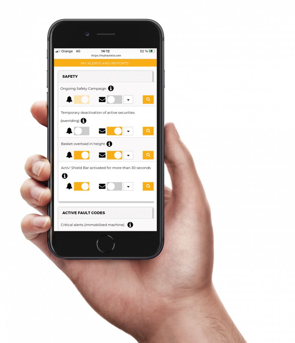 Il portale sicuro MyHaulotte.com offre la migliore esperienza utente e raccoglie tutte le informazioni chiave sulla flotta sotto forma di dashboard, mappe interattive e report per semplificare l’attività quotidiana. Disponibile su desktop e dispositivi mobili, l’interfaccia consente inoltre di accedere a una moltitudine di servizi relativi al parco macchine: monitoraggio delle campagne di sicurezza, documentazione tecnica, pezzi di ricambio, richieste di intervento tecnico.