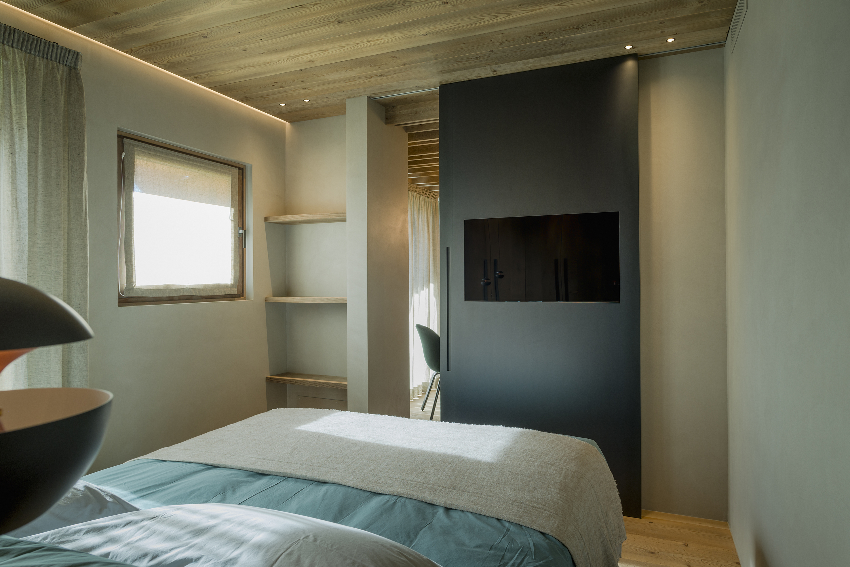 Porte e pareti si uniscono rivestite da Cementowabi anche nella seconda abitazione privata che si distingue per l’unione dei toni caldi del legno e delle vivaci tonalità di verde e turchese.
