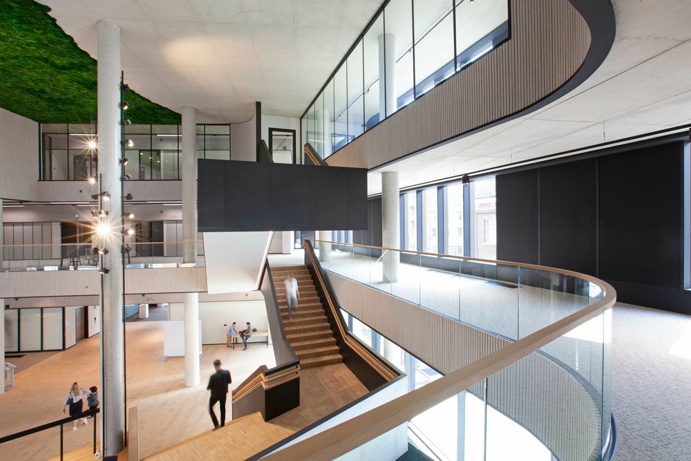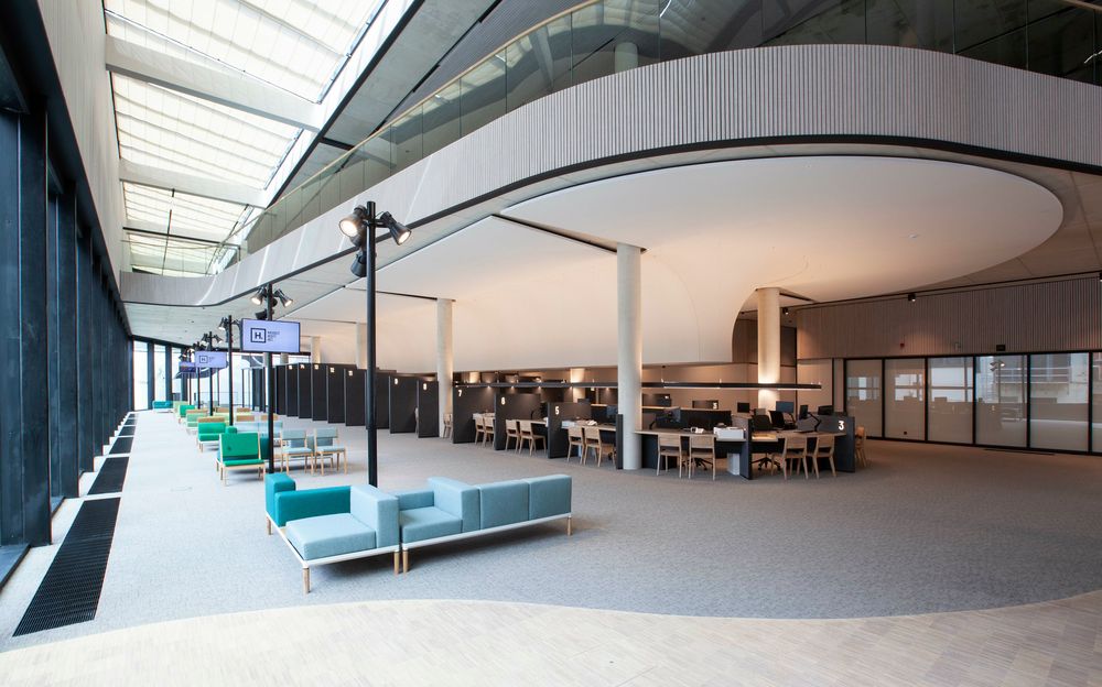 Il Municipio di Hasselt in Belgio è il primo edificio che ha utilizzato il sistema a parete HeartFelt applicandolo su una superfice di 4mila mq. Nell’atrio d’ingresso, i muri con altezze variabili da 8,5 m a 4 m per 40 m di lunghezza, sono rivestiti con doghe verticali in feltro. Le doghe continuano per altri 22 m fino ad arrivare agli uffici. Le stesse doghe sono state posizionate, sempre in verticale, anche sul parapetto ondulato del mezzanino della sala pubblica. Negli uffici, le pareti sopra gli armadi a parete sono fiancheggiate con doghe poste in orizzontale. Quest’ultimo rivestimento di parete s’integra parzialmente con il controsoffitto.