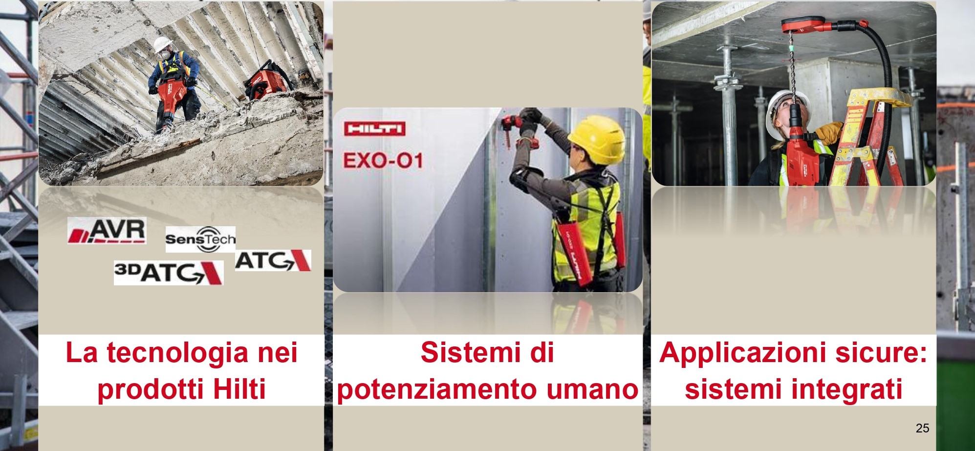 «Nostro altro grande pilastro è la sostenibilità sociale dell’azienda. Per le imprese garantire un ambiente salubre e sicuro è fondamentale. Hilti offre un aiuto in questa direzione, grazie a un parco attrezzi tecnologicamente avanzato e con strumenti dotati di innovazioni certificate per la sicurezza. L’azienda ha anche introdotto sul mercato dispositivi di potenziamento umano per aiutare l’operatore a ridurre la fatica. Il design leggero e compatto dei nostri attrezzi permette infatti di coniugare sicurezza ed ergonomia, per operare più agevolmente quando, ad esempio, è necessario utilizzare gli strumenti al di sopra delle spalle o in spazi ridotti. È nostro il brevetto relativo al comando tattile SensTech, un blocco di sicurezza che spegne automaticamente l’attrezzo quando l’operatore lascia la presa in caso di caduta accidentale».