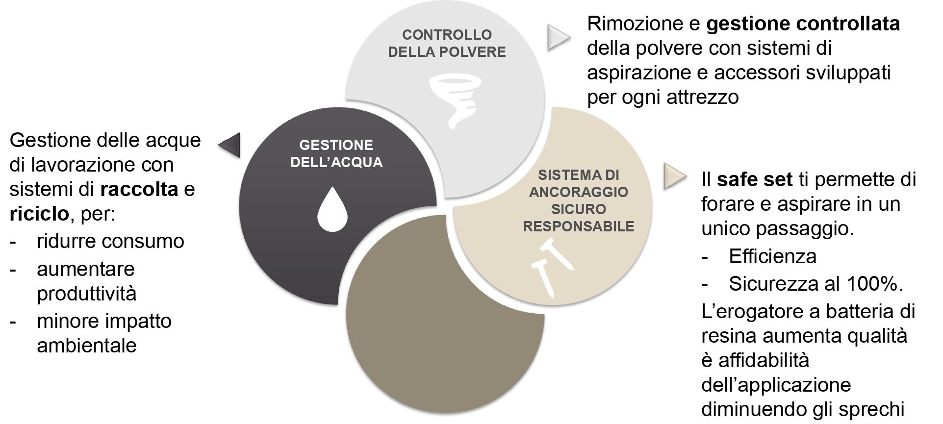 Per la riduzione delle vibrazioni Hilti propone il sistema Active vibration reduction TE 1000-AVR breaker, che diminuisce al minimo le vibrazioni mano-braccio, permettendo così di operare a lungo, in un ambiente più confortevole. Per quanto riguarda la rimozione della polvere, il sistema Dust removal system Te DRS-Y consente di lavorare in un contesto quasi privo di polvere.