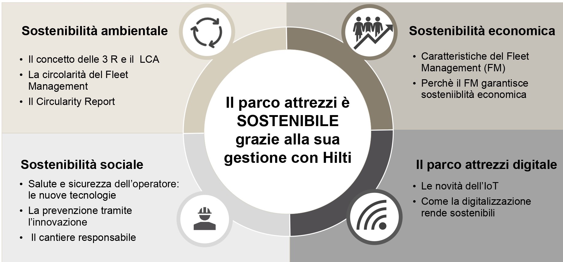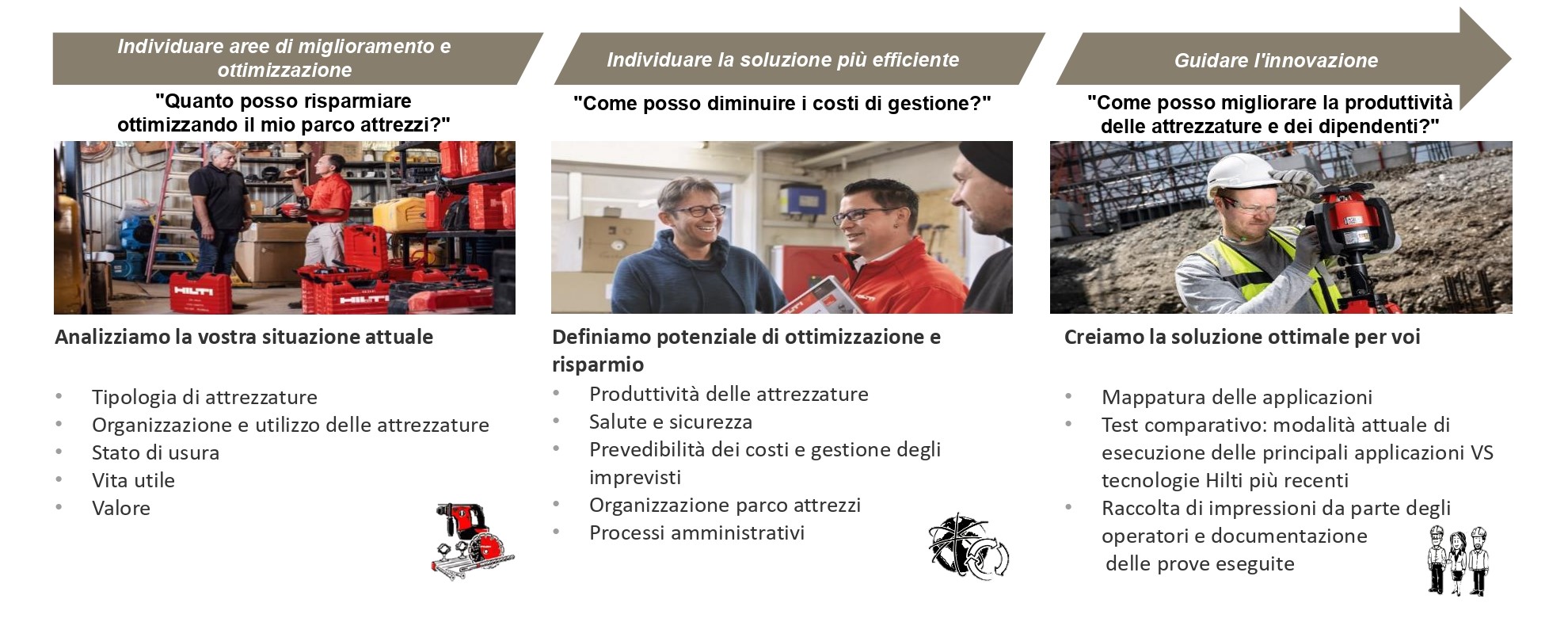 «Per noi di Hilti l’economia circolare, applicata alla gestione del parco attrezzi, si concretizza nel fleet management. Si tratta di un servizio di noleggio delle nostre attrezzature, che punta alla riduzione del fabbisogno di attrezzi grazie alla digitalizzazione, al tool sharing e al riciclo dei materiali. Con un canone mensile, il servizio permette di massimizzare la produttività degli attrezzi e ridurre gli imprevisti e i costi di gestione. In questo modo, grazie al rinnovo periodico delle attrezzature giunte a fine ciclo di vita, l’impresa può impiegare attrezzi sempre nuovi, disporre di riparazioni gratuite e rapide, fare leva su un servizio on demand, pagare solo i giorni di utilizzo, contare sulla copertura fino all’80% in caso di furto anche in cantiere, disporre di un servizio di consegna e recupero degli attrezzi, poter contare sulla calibrazione degli attrezzi e la manutenzione preventiva gratuita. Infine, avere il monitoraggio e la gestione delle attrezzature mediante un’app dedicata. Accanto a questo servizio, l’impegno di Hilti sul fronte ambientale si concretizza anche nell’attività di riciclo dei materiali impiegato: sulla massa di un nuovo attrezzo, la percentuale di riciclato – acciaio e plastica – è pari al 27%».
