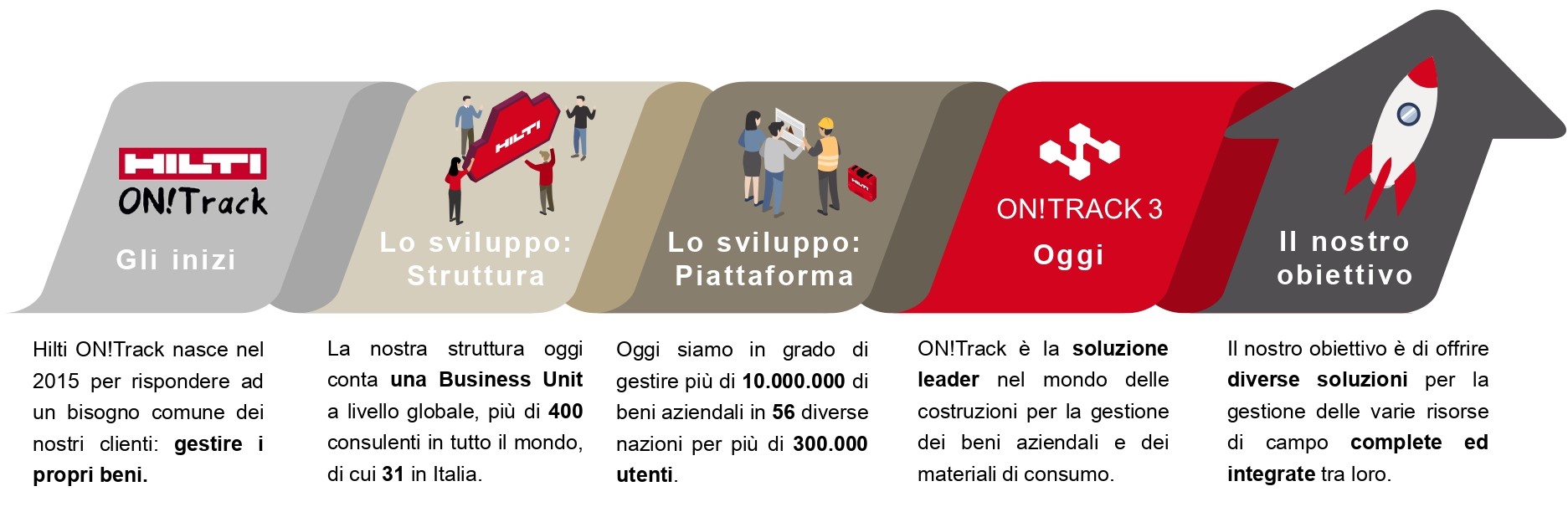 «ON!Track è utilizzata in 56 Paesi nel mondo. È personalizzabile e studiata per risolvere la gestione di asset, servizi e certificazioni, mettendo in relazione il cantiere e l’ufficio attraverso i dati. È studiata per integrarsi nelle attività quotidiane, per garantire maggiore efficienza, ottimizzare flussi di lavoro, tempi e risorse. Ha un impatto anche sulla circolarità, potendo sfruttare tutti i vantaggi del digitale».
