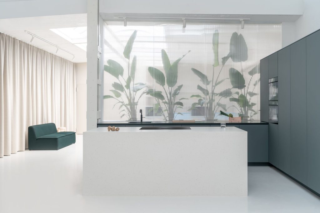 Per questo ambiente, in cui il minimalismo incontra lo stile industrial, il product designer Alexander von Dombois ha attentamente valutato la scelta dei colori degli elementi realizzati in Himacs.