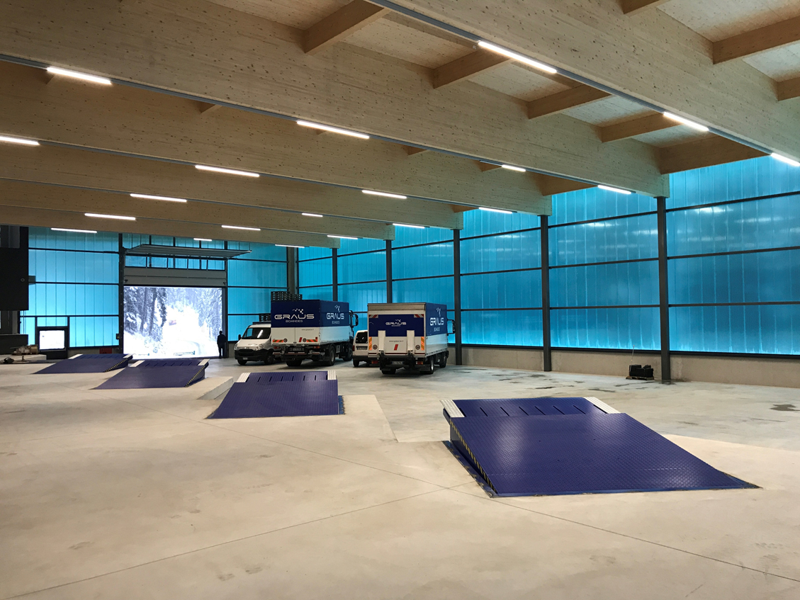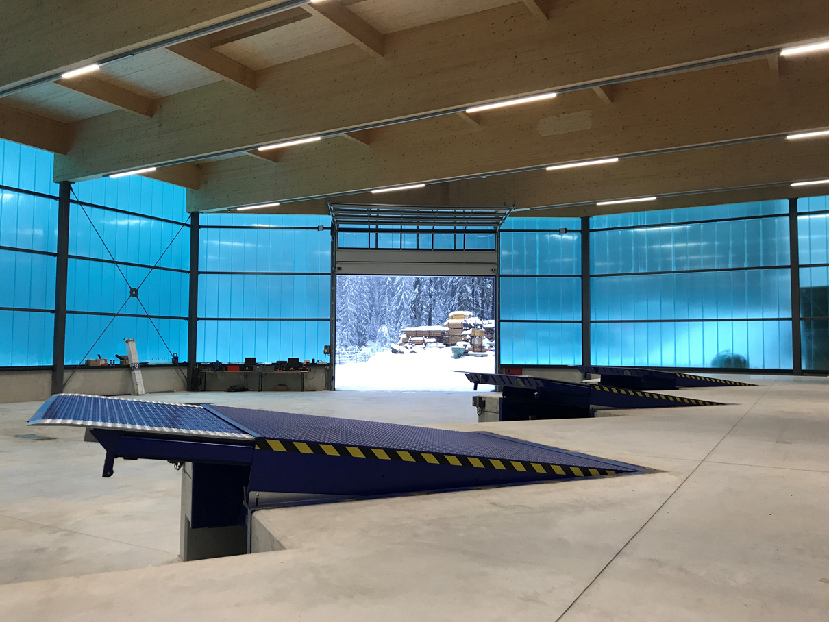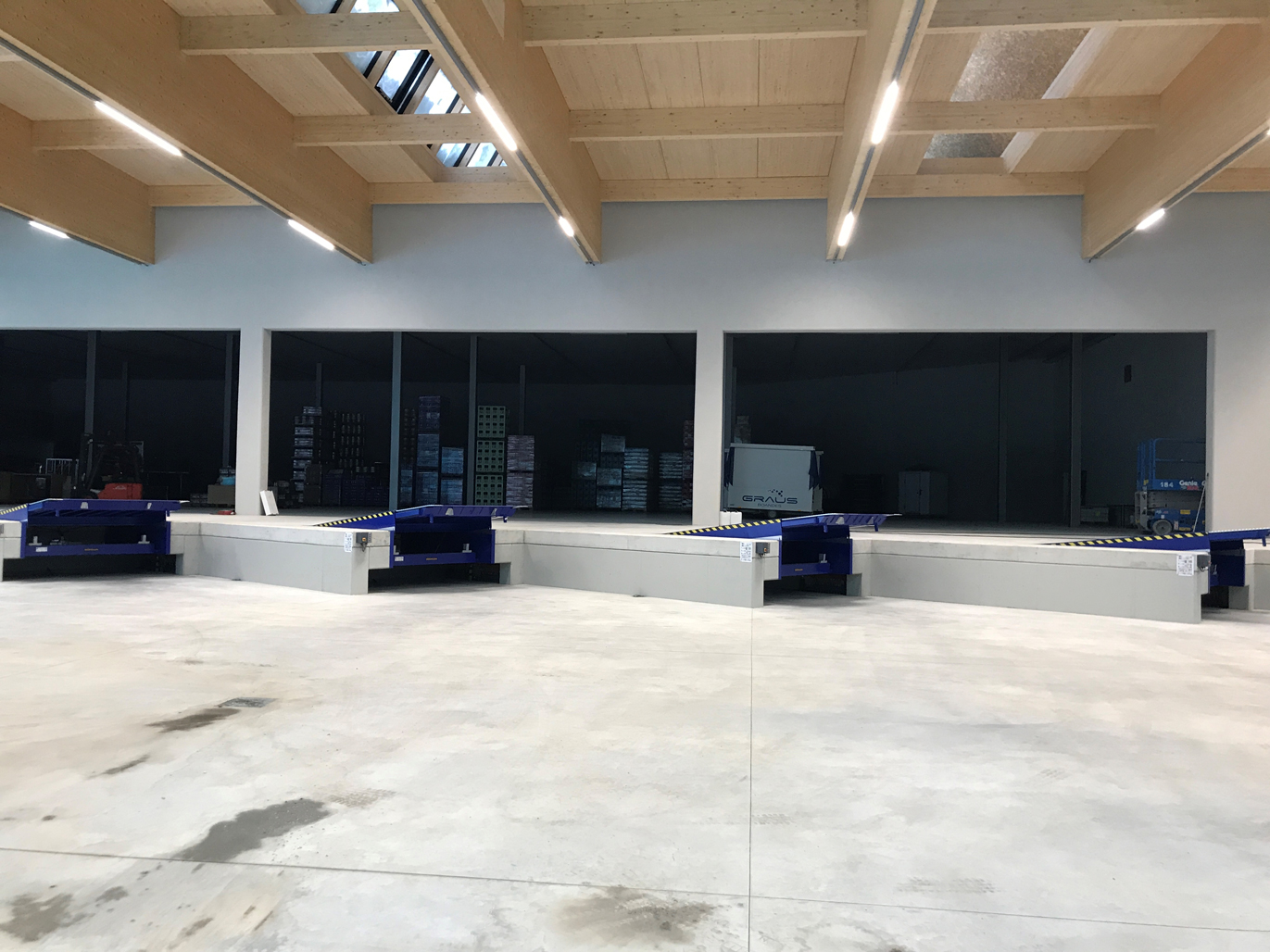 La costruzione è stata affidata a imprese rinomate, utilizzando strutture verticali in acciaio e grandi travi in legno lamellare per la copertura. Per la chiusura dei varchi carrabili e per facilitare le attività logistiche abbiamo selezionato portoni sezionali e rampe di carico prodotte da Hörmann.