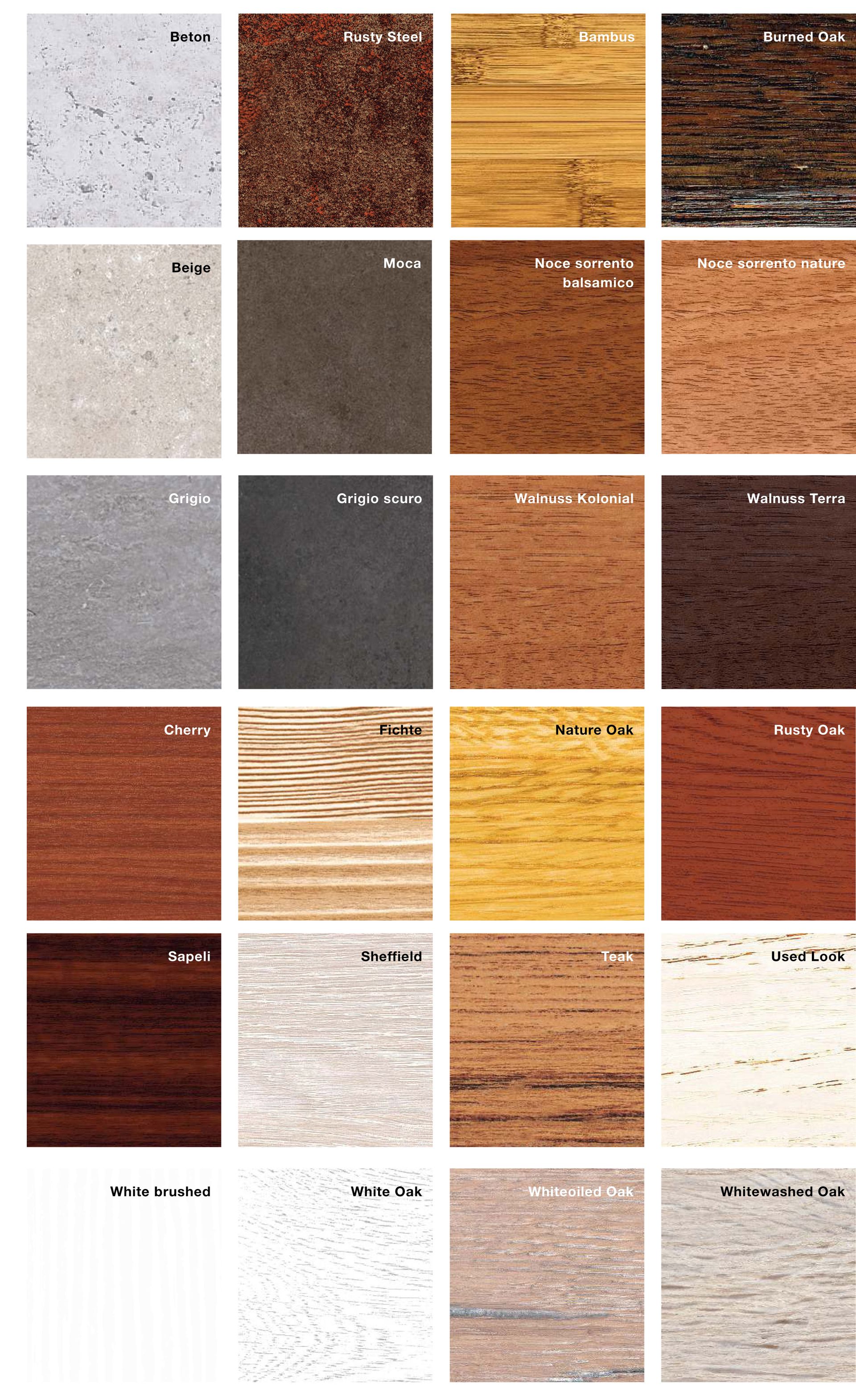In merito alla versione simil-legno, è possibile scegliere tra diverse tipologie di superfici, in grado di riproporre fedelmente il carattere di più legni, fra gli altri white oak, bambù e Teak.