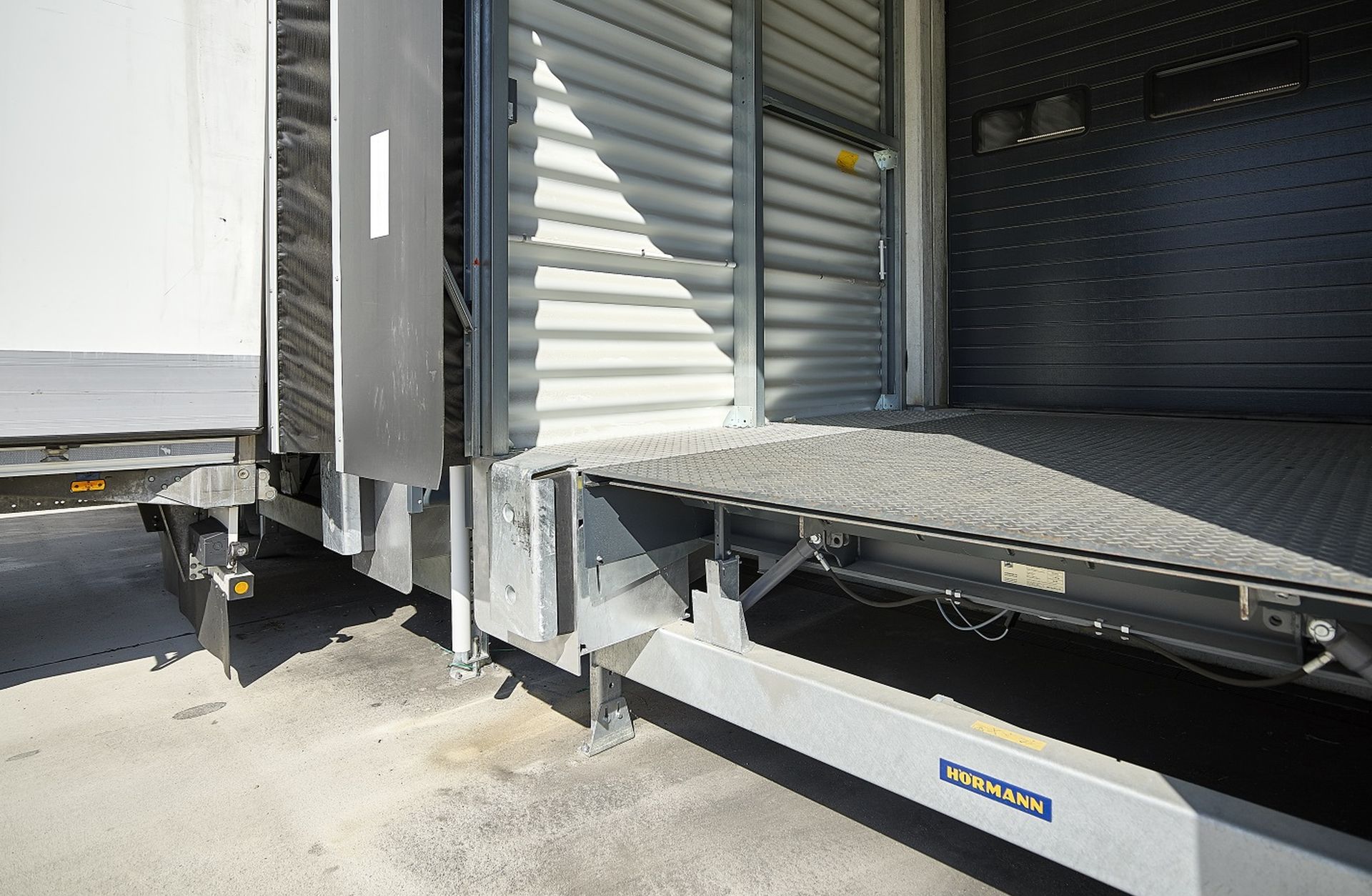 I portoni sezionali SPU F42 sono stati combinati con la pedana di carico idraulica HTL2, con fronte estendibile lungo 500 mm per compensare i dislivelli tra la banchina ed il pianale di carico dell’autocarro. Gli elementi di rinforzo della piattaforma, il fronte estendibile e le guide di scorrimento laterali assicurano movimenti regolari ed affidabili.