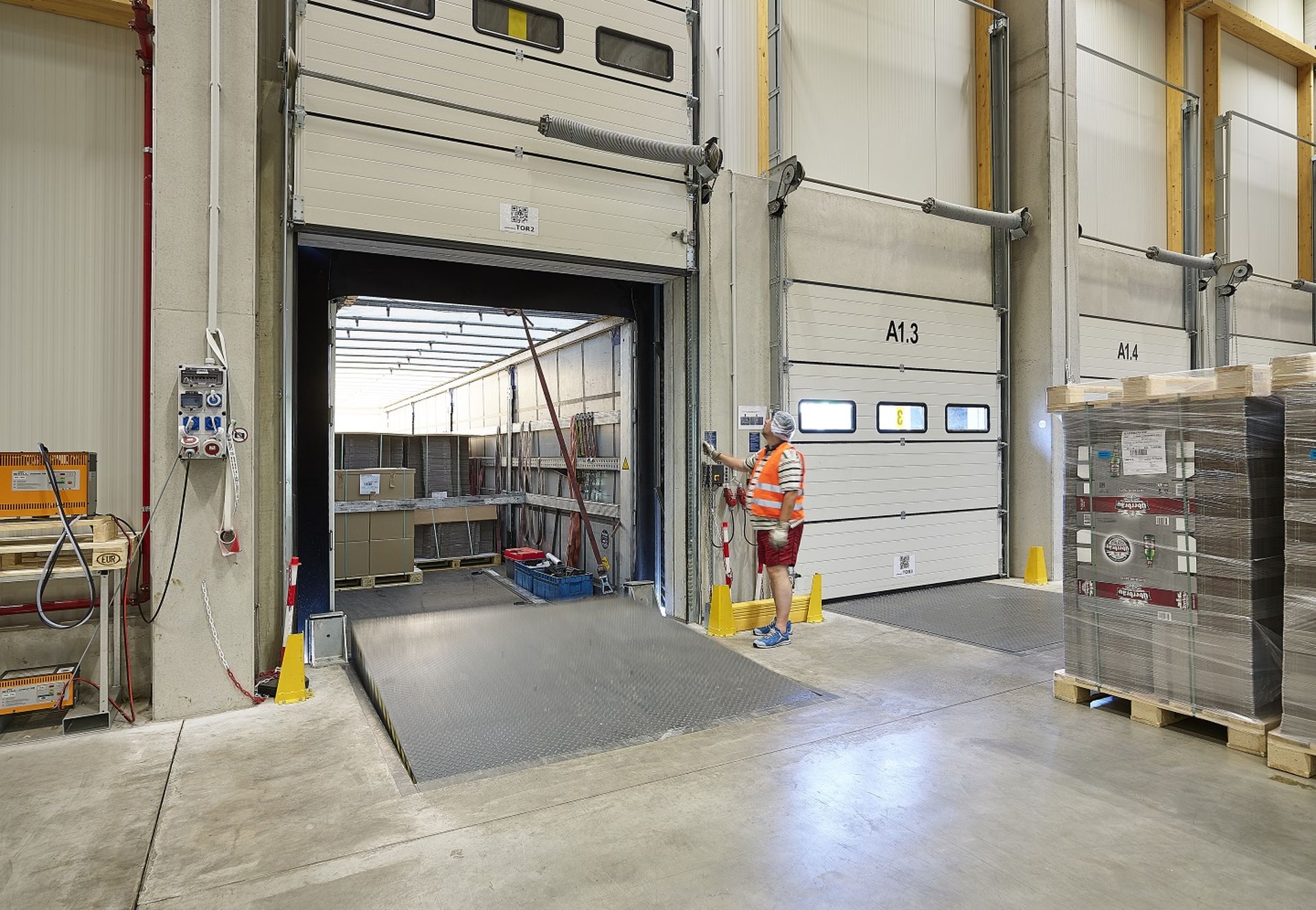I portoni SPU 67 sono realizzati con pannelli in acciaio a doppia parete che minimizzano lo scambio termico evitando la formazione della condensa sul lato interno. Anche le 17 pedane di carico idrauliche Hörmann HRT, installate sulla parete esterna in corrispondenza dei boccaporti, sono equipaggiate con il fronte estendibile e dispongono di un basamento di supporto che sostiene il boccaporto.