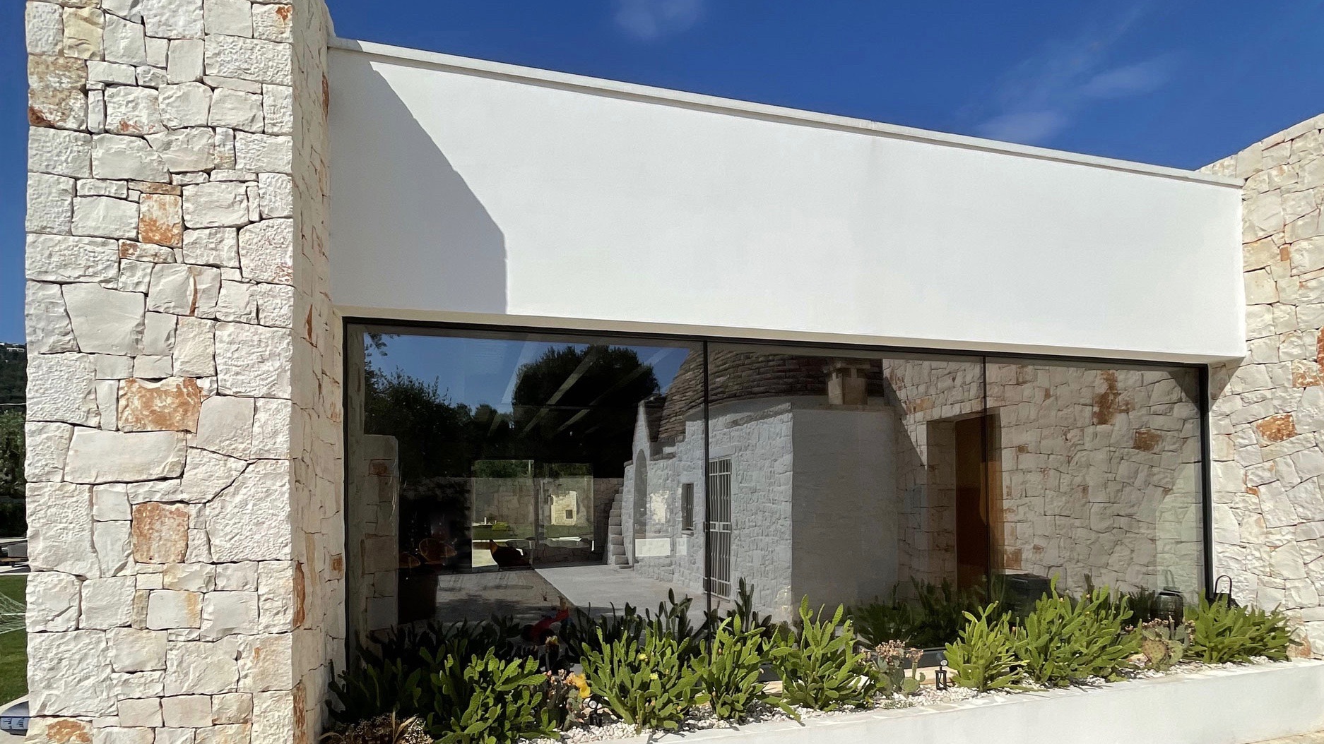 Lo studio Fos Architetti ha curato la direzione dei lavori: «L’immagine minimalista dell’ampliamento è esaltata dalle qualità materiche tipiche dell’edificio originario. La pietra locale posata a secco costituisce la trama della costruzione, ordita con materiali contemporanei come il cemento, le resine e l’acciaio corten, a formare campiture uniformi capaci di dialogare con il paesaggio».