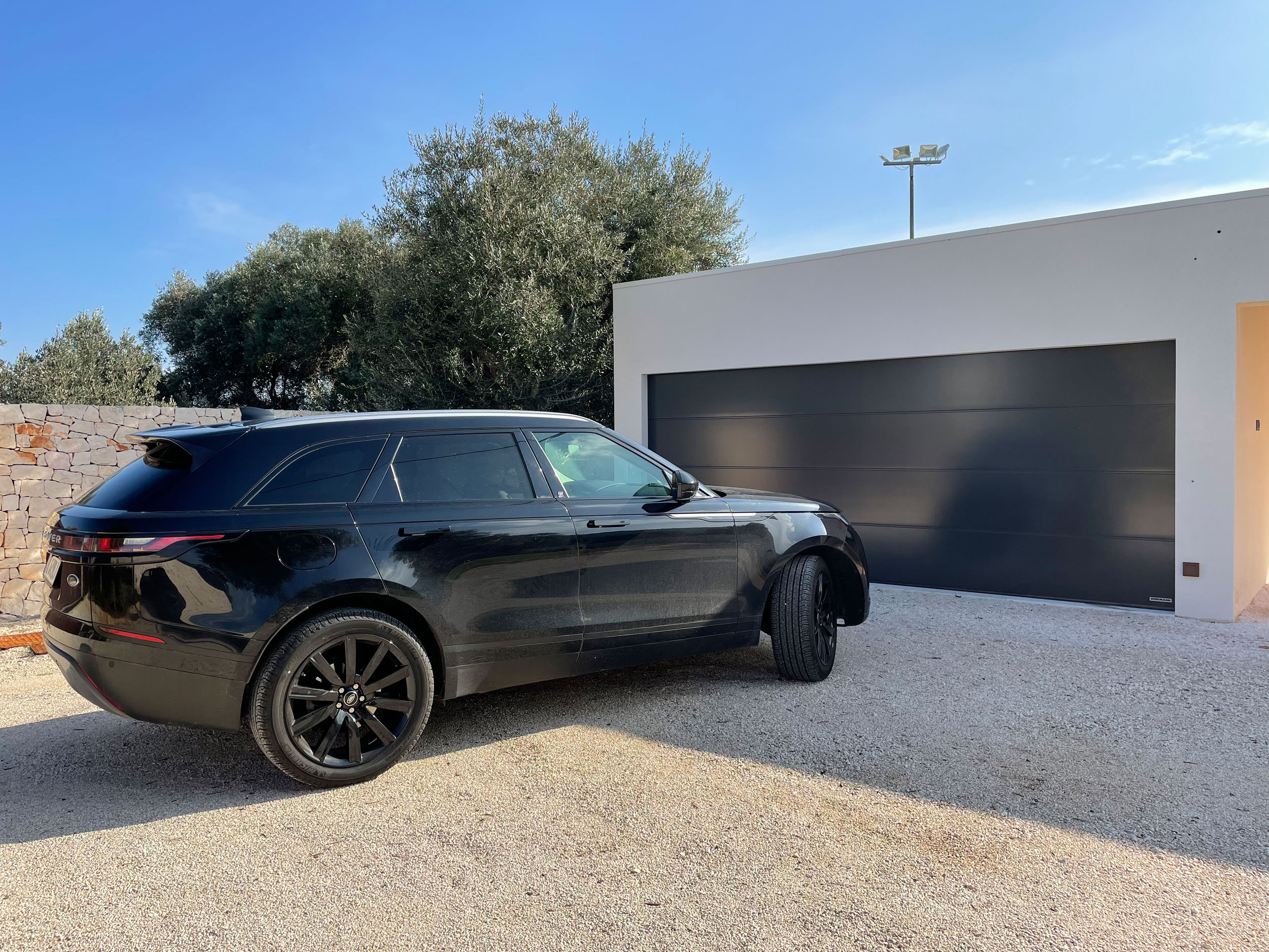 Per il garage di Villa D è stato utilizzato un unico portone LPU 42 (larghezza 5.500 mm; altezza 2.250 mm) con finiture Silkgrain (esterno) e goffrata (interno) e verniciatura grigio antracite (RAL 7016).