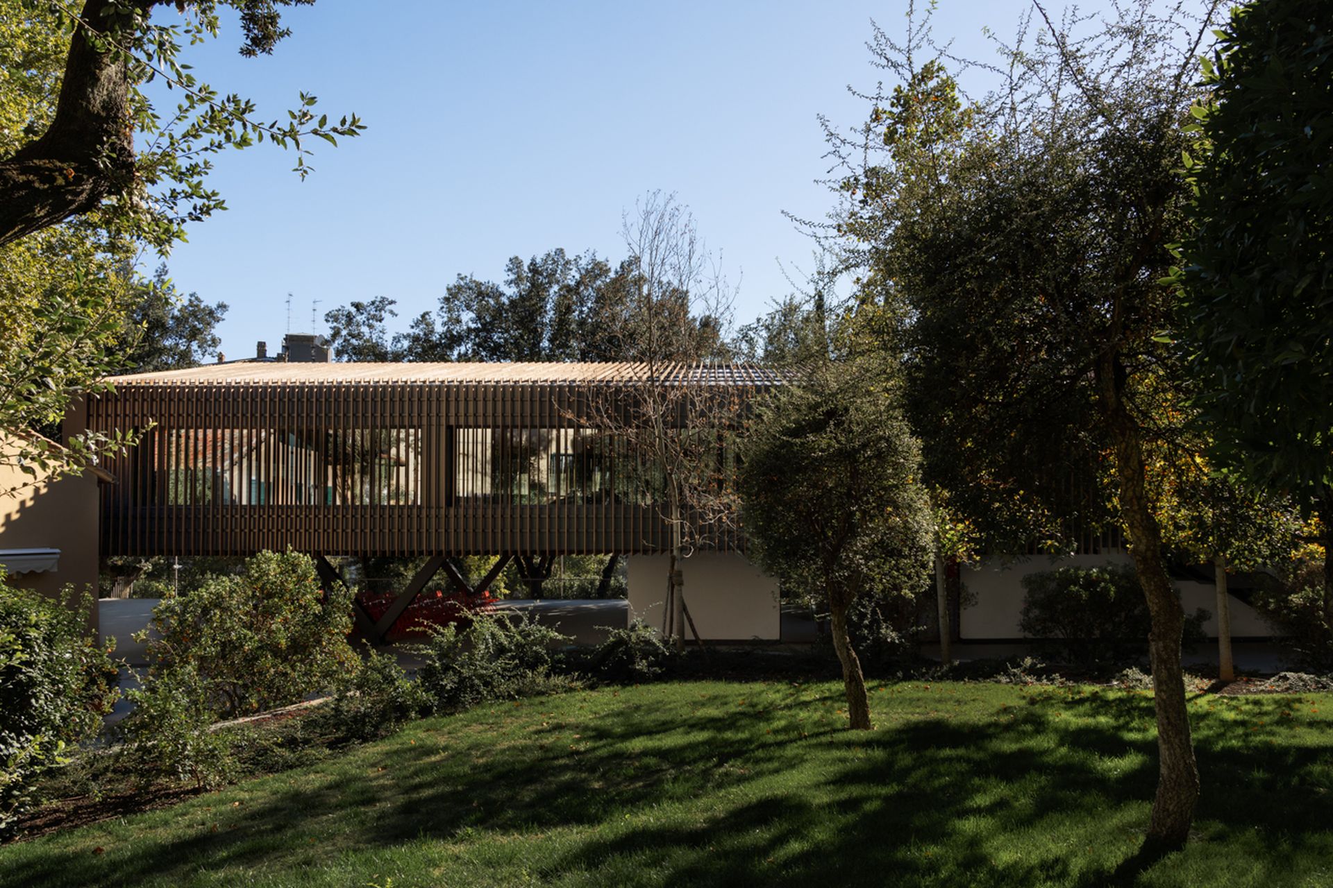 Una scala a rampe incrociate collega internamente i due livelli tramite uno spazio a doppia altezza, mentre una terza scala connette il primo piano con l’esterno. Il piano terra, visibilmente arretrato, sottolinea ancor di più la leggerezza del volume superiore e crea uno spazio aperto e coperto al tempo stesso, attrezzato per corsi e attività all’aperto.