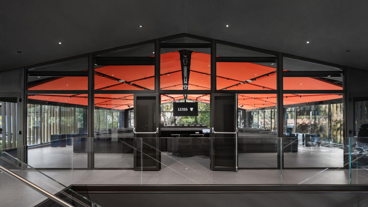 I pannelli acustici sospesi che definiscono il controsoffitto dell’anfiteatro, dal colore rosso corallo, catturano l’attenzione fin dall’esterno, mentre la loro silhouette organica rafforza il dialogo con il boschetto adiacente. Lo stesso rosso acceso caratterizza gli arredi e alcuni elementi delle aule — un dettaglio ricercato che conferisce all’intero complesso grande coerenza visiva, soprattutto quando il volume si accende nelle prime ore serali.