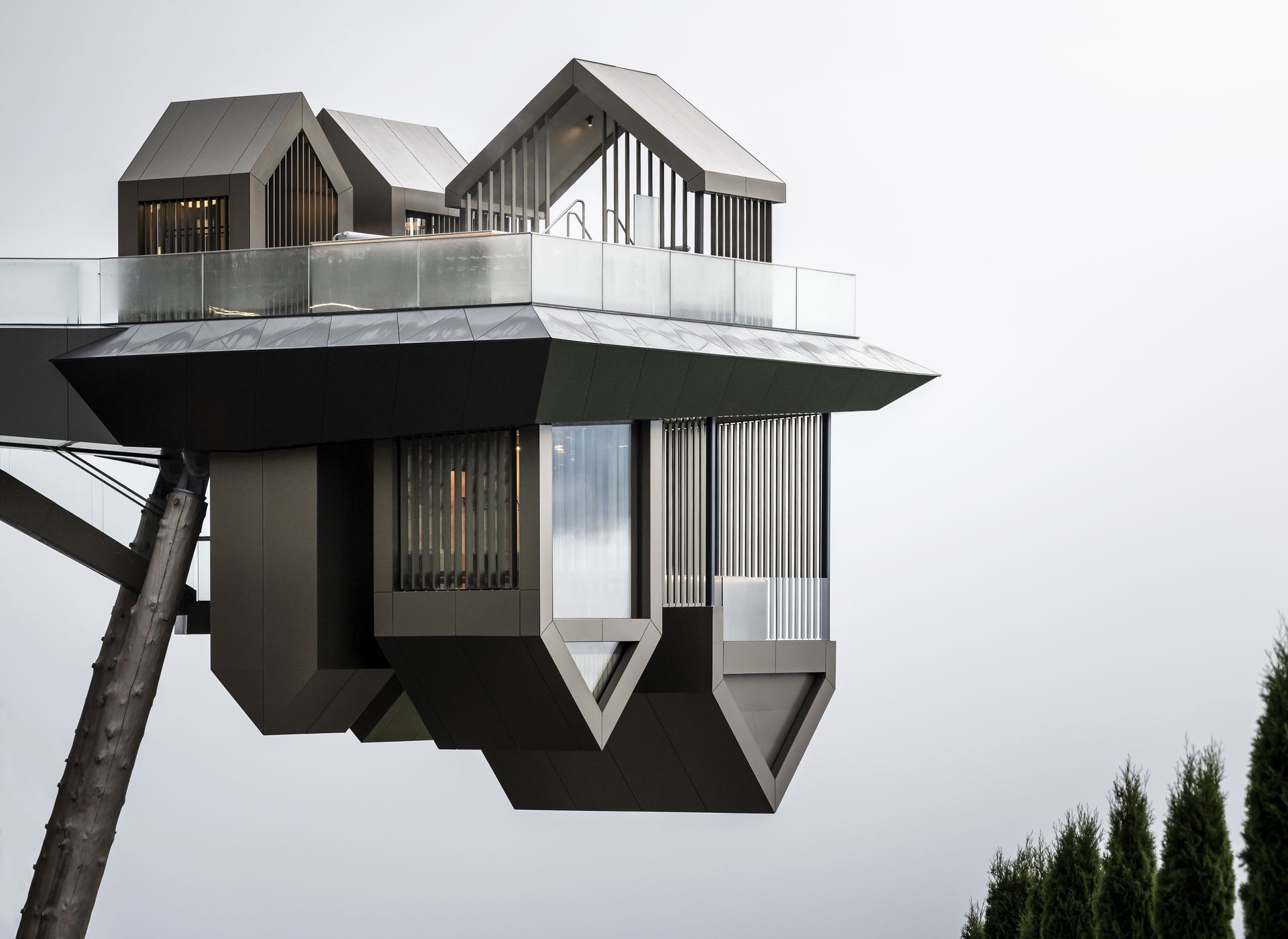 La nuova costruzione si colloca sul lato sud-est di facciata, in una posizione speculare rispetto alla piscina. Come questa, anch’essa si stacca dal corpo principale della struttura: si tratta infatti di una piattaforma a sbalzo, sospesa di 15 m rispetto al livello del terreno e sorretta da due pilastri rivestiti in tronchi di larice, analoghi a quelli che ritmano il prospetto retrostante.