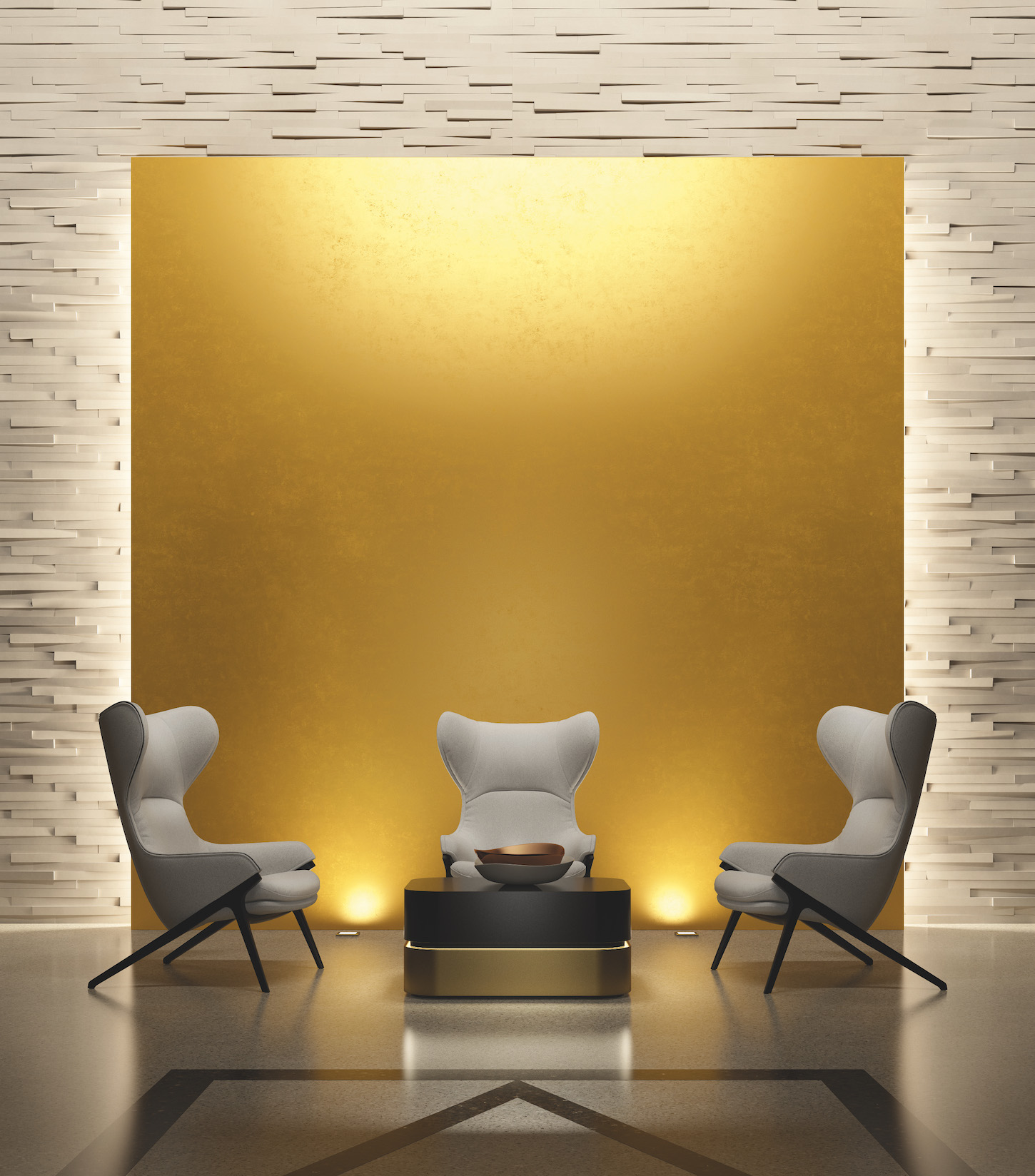 La collezione LuxOr comprende finiture preziose nella tinta oro zecchino che infondono una sensazione di calore e ricercatezza creando giochi luminosi a seconda della modalità di applicazione.