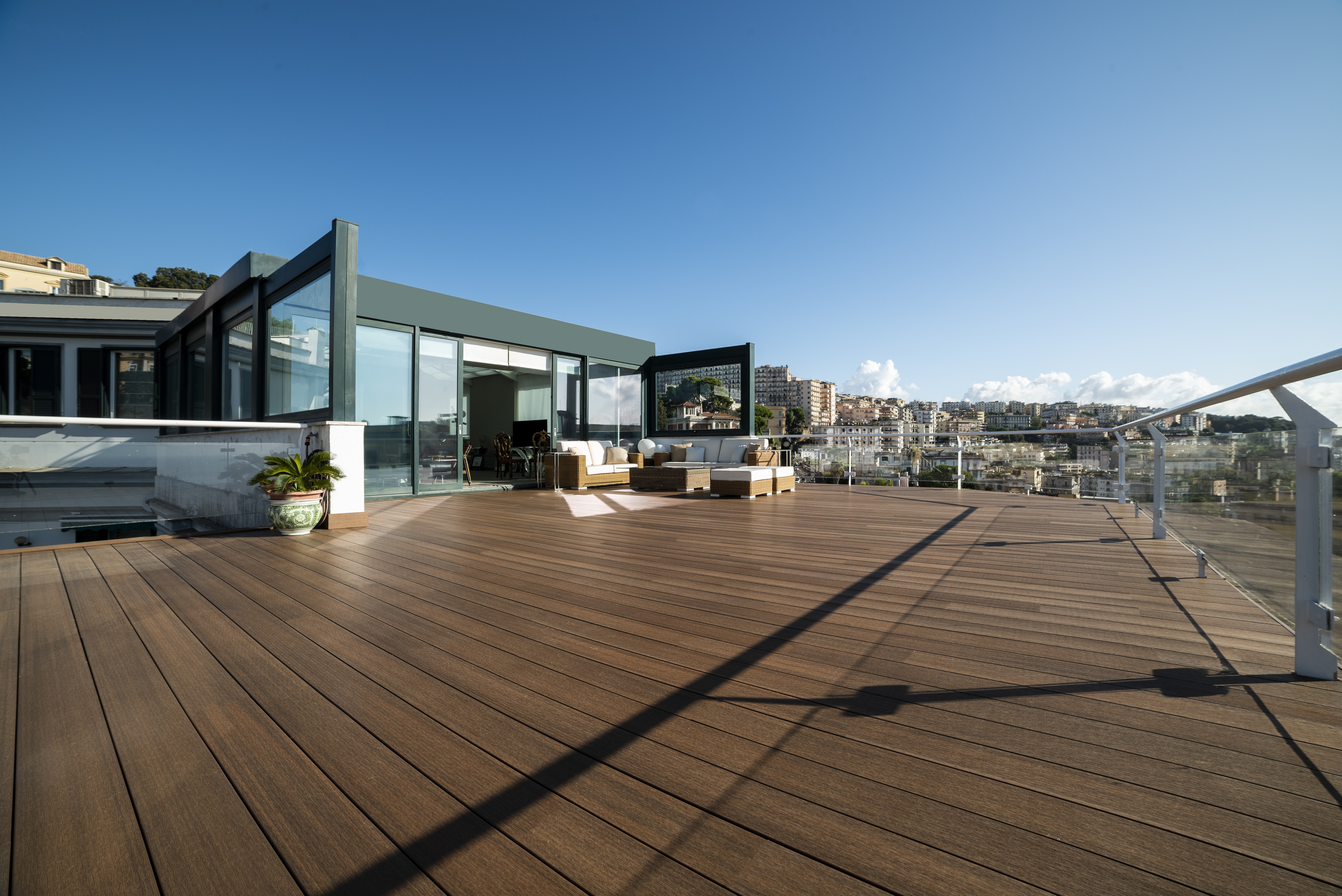 Con l’arrivo della bella stagione balconi, verande, terrazzi ed anche giardini trovano nuova vita, diventando i luoghi da vivere per la maggior parte del tempo. A tal proposito Déco mette a disposizione una gamma di rivestimenti in grado di offrire soluzioni per gli esterni, ma anche di continuità tra interno ed outdoor, perfette per l’habitat contemporaneo: pavimenti, controsoffitti, moduli frangisole possono partire all’interno degli ambienti per proseguire armoniosamente verso l’esterno.