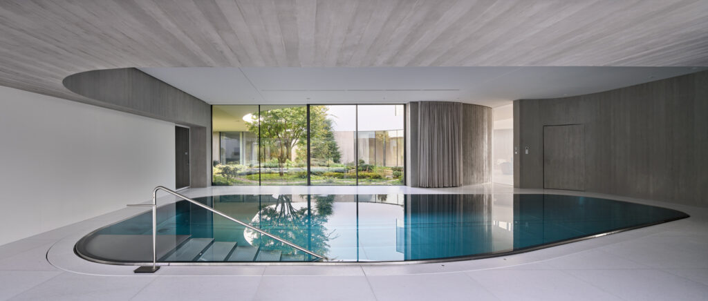 Le curve sinuose del paesaggio sono state grande fonte di ispirazione per i progettisti. Il piano terra riprende questa sinuosità inserendosi dolcemente nell’ambiente. Lungo il perimetro della casa si susseguono delle ampie vetrate che fondono l’interno con l’esterno. Per quanto riguarda la facciata è stato utilizzato il cemento grigio che si armonizza bene con la pietra della strada preesistente.