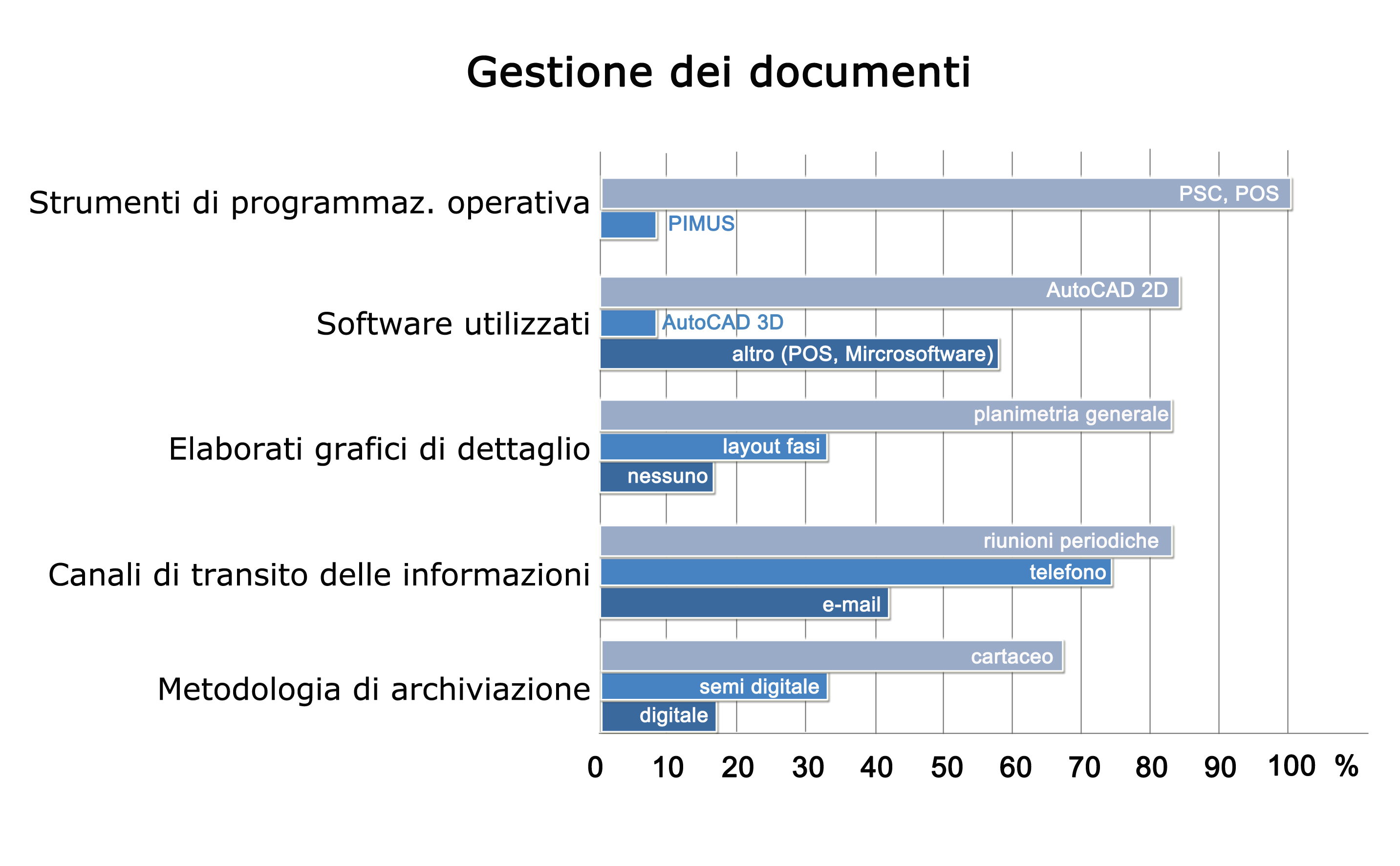 Dall’analisi dei risultati emerge in sintesi che la programmazione e la progettazione del cantiere avviene in generale attraverso i documenti obbligatori della sicurezza sostanzialmente in 2D e che le informazioni transitano nelle riunioni periodiche. Di conseguenza risulta evidente come sia la documentazione di sicurezza obbligatoria a caricarsi anche del significato più generale della programmazione operativa.