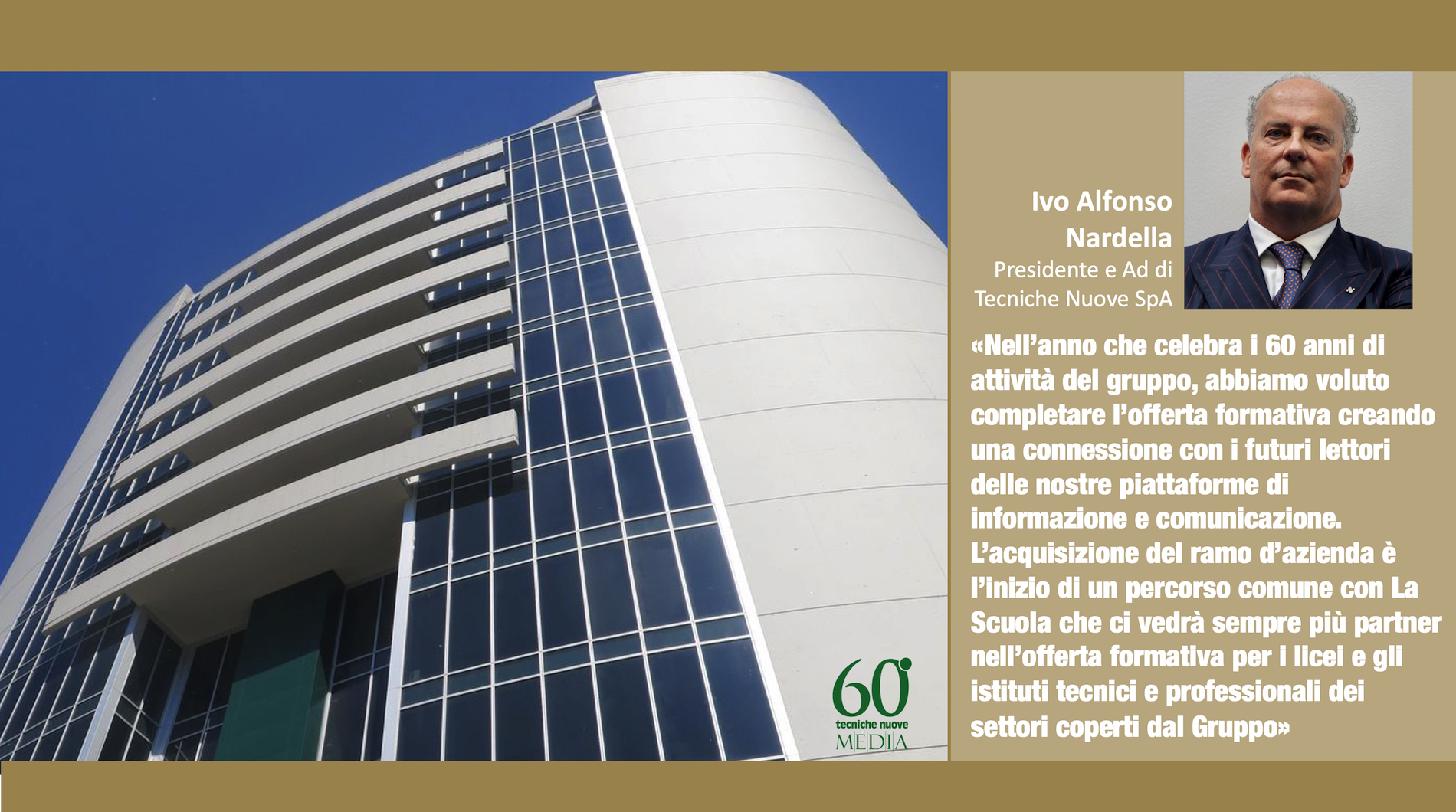 «Nell’anno che celebra i 60 anni di attività del gruppo, abbiamo voluto completare l’offerta formativa – dichiara Ivo Alfonso Nardella, Presidente e Ad del Gruppo Tecniche Nuove – creando una connessione con i futuri lettori delle nostre piattaforme di informazione e comunicazione. L’acquisizione del ramo d’azienda è l’inizio di un percorso comune con La Scuola, che ci vedrà sempre più partner nell’offerta formativa per i licei e gli istituti tecnici e professionali dei settori coperti dal Gruppo, primi fra tutti l’agroalimentare e il manufacturing, che rimane di gran lunga l’ambito in cui c’è più richiesta di diplomati Its con circa 14.300 entrate l’anno».