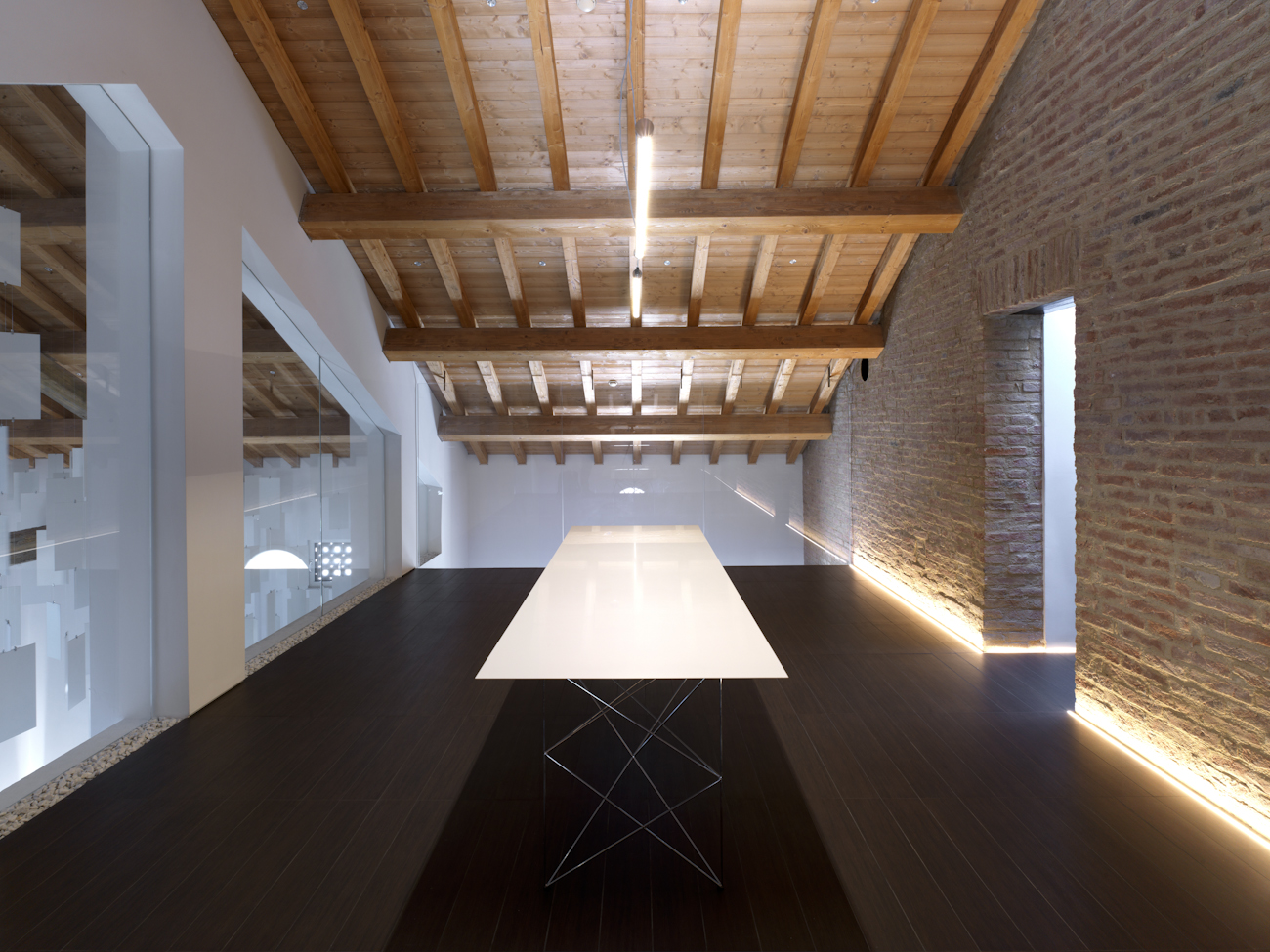Con continuità razionale tra le parti di recupero e quelle di ricostruzione, l’intervento sul contenitore si colloca in moderata armonia tra il rispetto della tipicità padana e la sua riproposizione in chiave di lettura contemporanea, esente tuttavia da manierismi e quasi atemporale. L’attenzione da sempre riservata dal progettista per la qualità dei materiali, si ritrova nel rapporto tra le preesistenze, le possenti murature piene in laterizio, che tornano a vista negli interni, e il ruolo del rivestimento in lastre ceramiche adottato come involucro leggero, lineare, per alcune superfici e al contempo come materiale d’arredo, nel progetto d’interni.