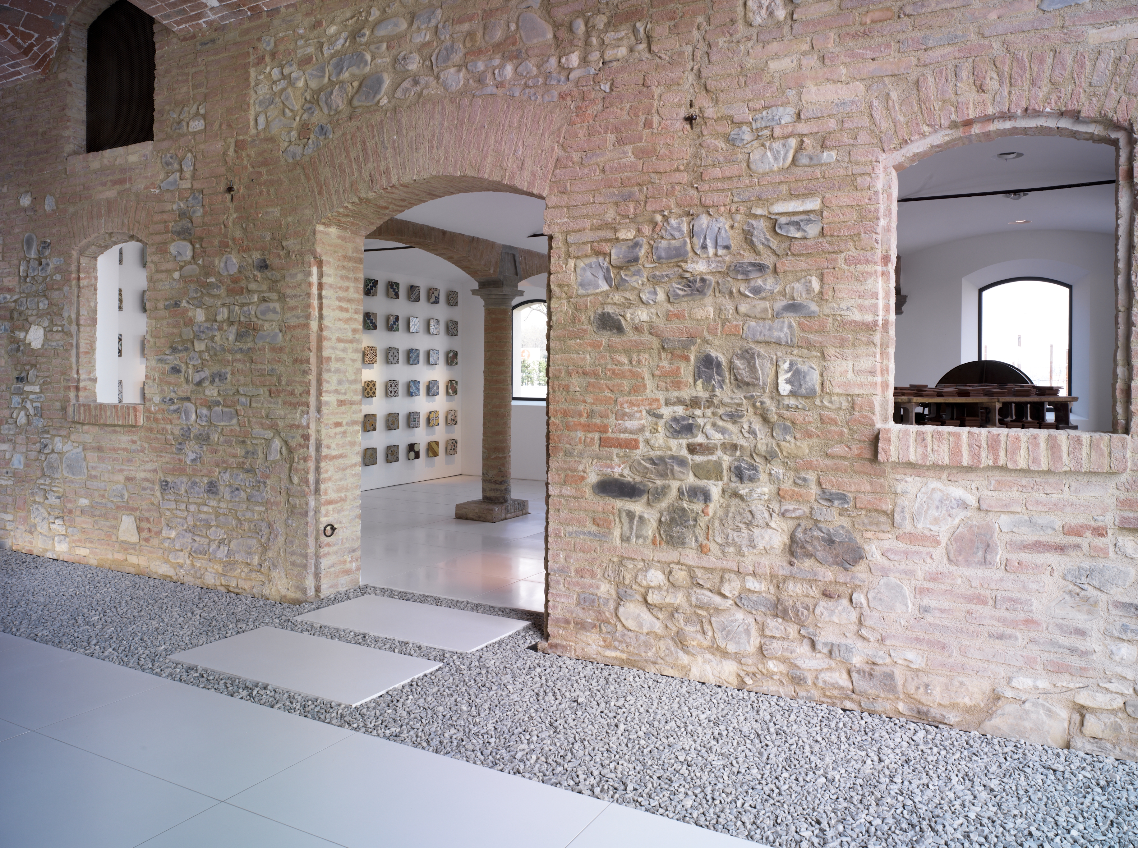 Il maestro giapponese non dichiara manifestamente nelle forme esteriori la propria presenza, lasciando ai materiali e alla qualità originaria del costruito, la possibilità di riemergere. La scatola architettonica si pone quindi come punto di osservazione sul paesaggio intorno e scrigno dell’architettura al suo interno. Vengono così preservate le dimensioni delle aperture, portati a vista minuti elementi laterizi rispetto a un intonaco omogeneamente stesso sulla facciata, conservati gli elementi traforati in laterizio collocati nelle aperture poste lungo l’asse di simmetria verticale del volume architettonico. Porzioni di muratura in cattivo stato di conservazione, in particolare nelle parti alte in prossimità della copertura, sono state ricostruite con blocchi forati in laterizio, per sostenere il sistema del tetto efficacemente ricostruito in travi a carpenteria lignea e coppi in laterizio.
