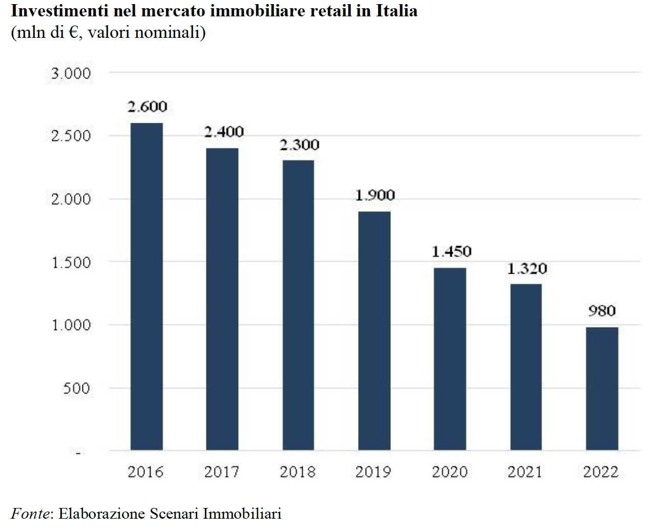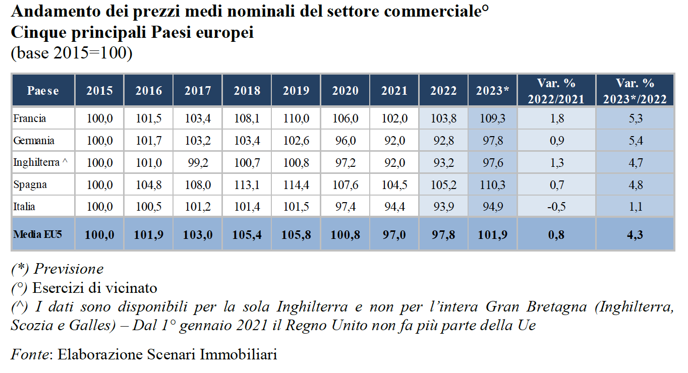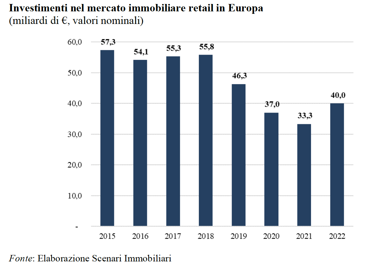 Le previsioni per il 2023 risultano incerte e fortemente correlate alla sostenibilità economica dei canoni di locazione e alla loro capacità di incidere sui rendimenti. Francia, Germania e Regno Unito continuano a rappresentare i mercati più attrattivi per i capitali destinati agli immobili commerciali, con investimenti che nel 2022 hanno raggiunto rispettivamente 6, 8,25 e 8,1 miliardi, mentre in Italia si è registrata una contrazione, con un valore totale pari a poco meno di 1 miliardo di euro.