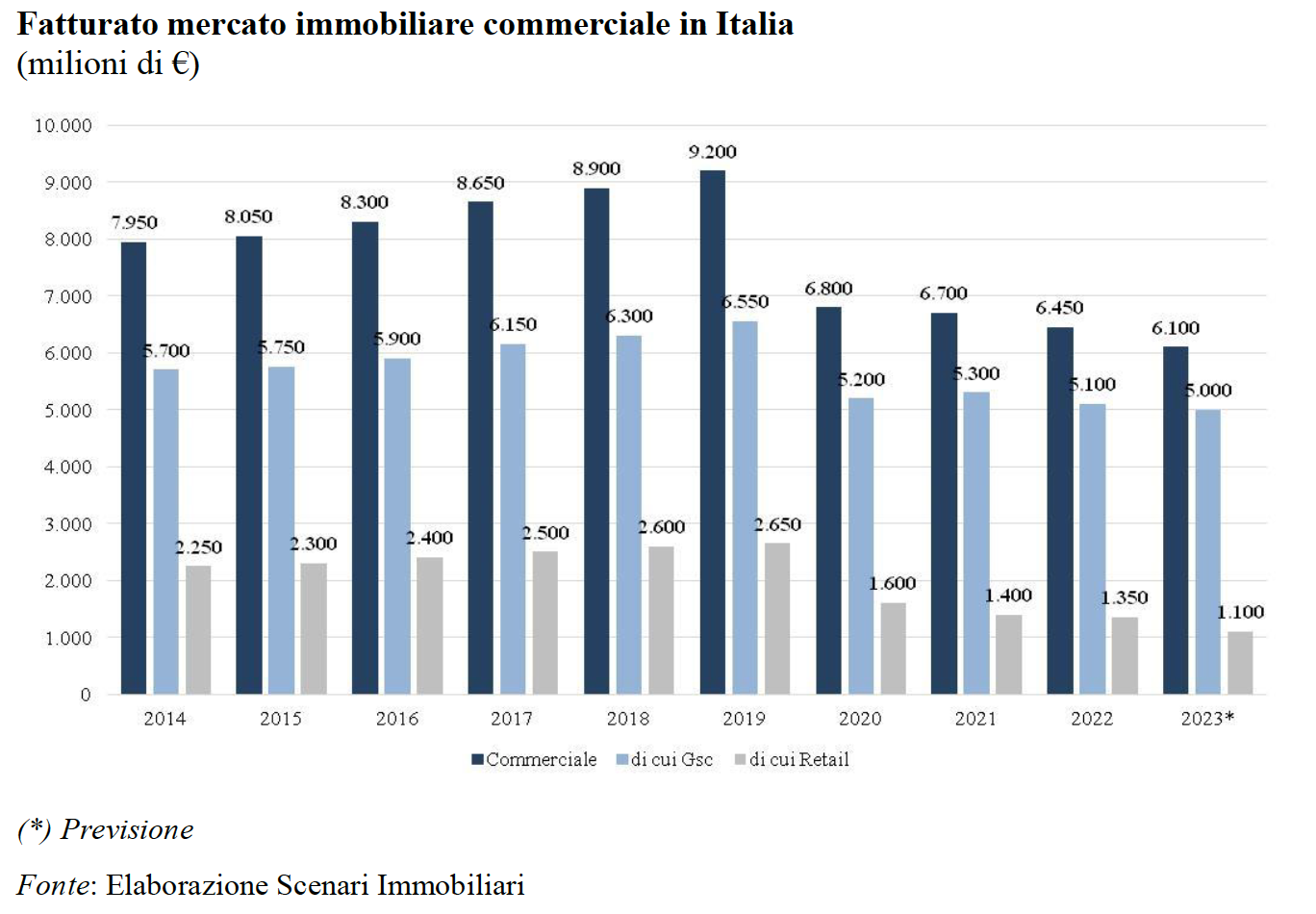 Nel corso del 2022 il mercato italiano degli immobili a uso commerciale ha fatto registrare un fatturato complessivo di quasi 6,5 miliardi di euro, derivante da attività di vendita e di locazione di spazi per il retail, in calo di 3,7 punti percentuali rispetto alla quota raggiunta nel 2021.