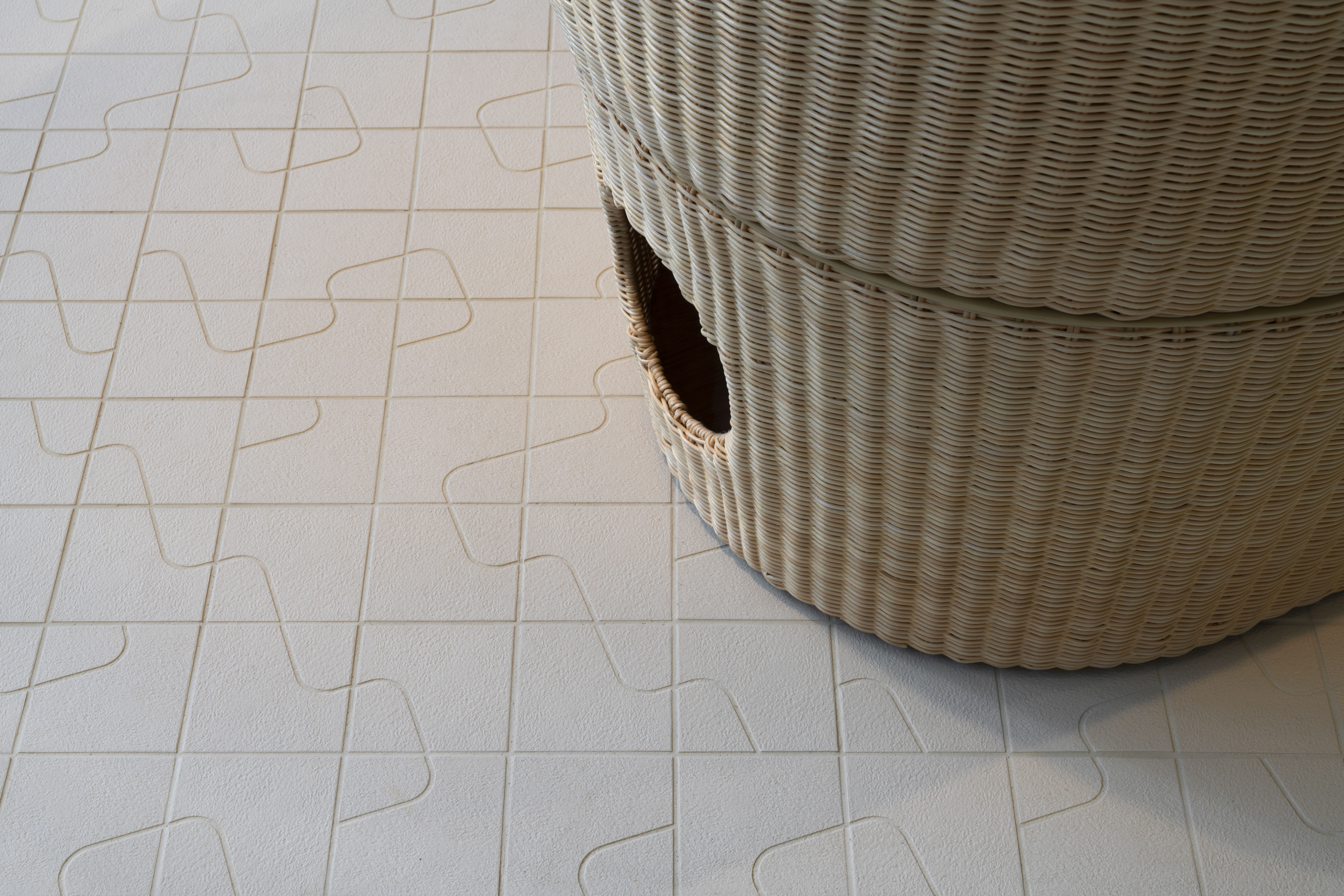 Disegnato da Marialaura Rossiello per Studio Irvine, il progetto nasce da una stecca 9×9 cm in grès porcellanato a tutta massa, nella quale viene inciso uno spicchio dal resto della mattonella. Dopo la stuccatura esteticamente risultano due parti separate.