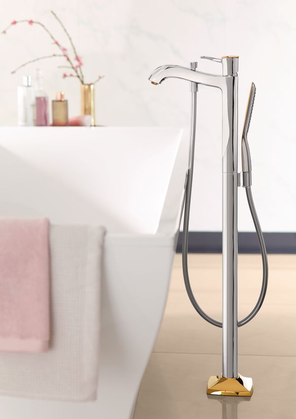 Il nuovo miscelatore a pavimento Hansgrohe Metropol Classic ha un design classico e la finitura cromo-oro e si adatta alle vasche freestanding.