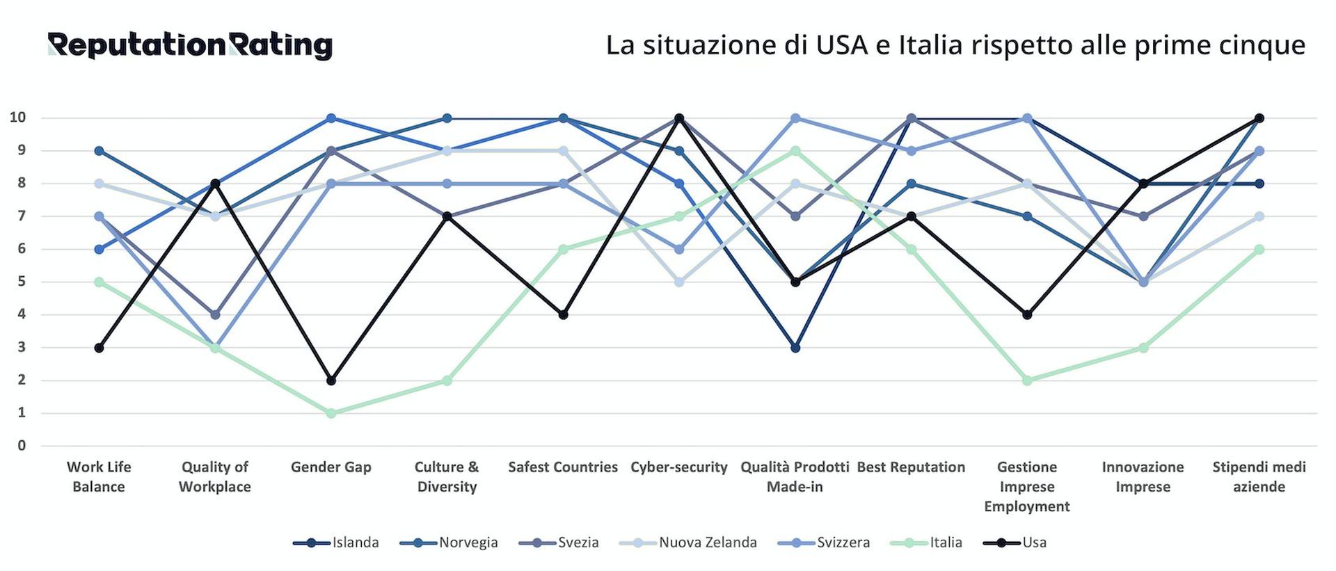 «L’Italia, purtroppo, è risultata essere quasi fanalino di coda al 32° posto, registrando performance negative in gestione delle carriere, stipendi medi e gestione delle diversità. Invece, tra i parametri più positivi sembra esserci la percezione della qualità dei prodotti Made-in Italy, per la quale l’Italia si posiziona al 7° posto tra i 35 analizzati. C’è molto da lavorare anche per quanto concerne la qualità dell’ambiente di lavoro, dove l’Italia ricopre il 28° posto. A stupire, però, è la posizione degli Stati Uniti, solo 21°, principalmente a causa del Gender Gap e del Work-life balance, asset che hanno controbilanciato di molto in negativo le performance positive riscontrate per le altre caratteristiche».