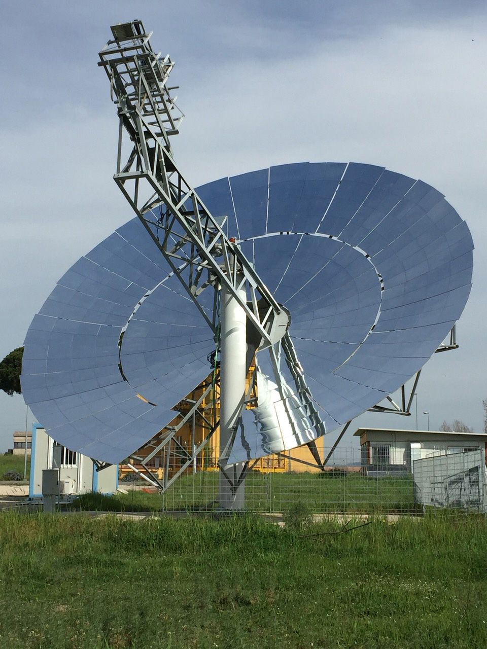 Ha un diametro di 12 m e una superficie di 88 mq interamente ricoperta di specchi solari che concentra in una piccola area focale fino a 2mila volte la radiazione solare: rispetto al fotovoltaico tradizionale avrà il vantaggio di stoccare l’energia assorbita e trasformarla in elettricità on demand, anche di notte o in assenza di irraggiamento solare.
