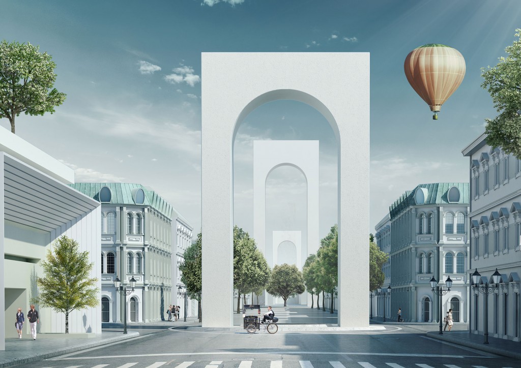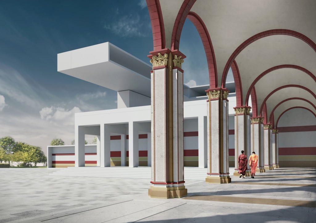 PORTICO | Portico, loggia, broletto, sono strutture architettoniche e urbane di raccordo tra altre che stanno a esse al contorno. Sotto la pancia greve del palazzo del broletto, lungo la sequenza ritmata delle arcate e dei pilastri dei portici e dentro la gentile e avvolgente spazialità delle logge si partecipa ai fatti della città da una posizione protetta, particolare, calda e raccolta. Sono queste strutture che producono dimensioni intermedie dell’abitare sospese in un esterno domestico dentro il quale muoversi. Il Portico di Urbanocromie si riempie di colore attingendo dai toni del rosso, del rosa, dei gialli e del marrone. Come infinite sequenze spaziali, architetture del presente, del passato e del futuro si susseguono.