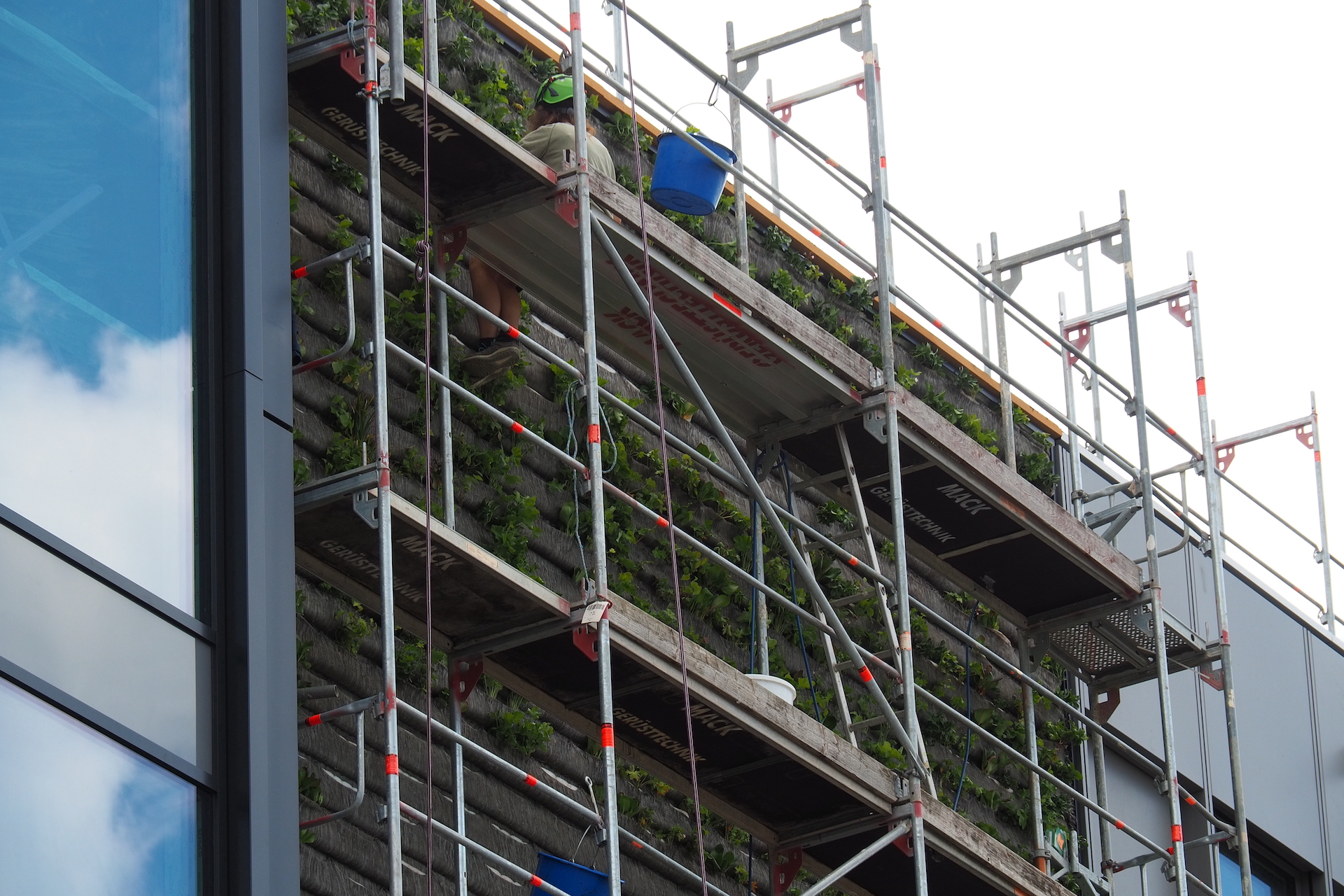 (Fase di realizzazione della facciata verde, progettata in collaborazione con la società Vertiko. Foto di Drees & Sommer)