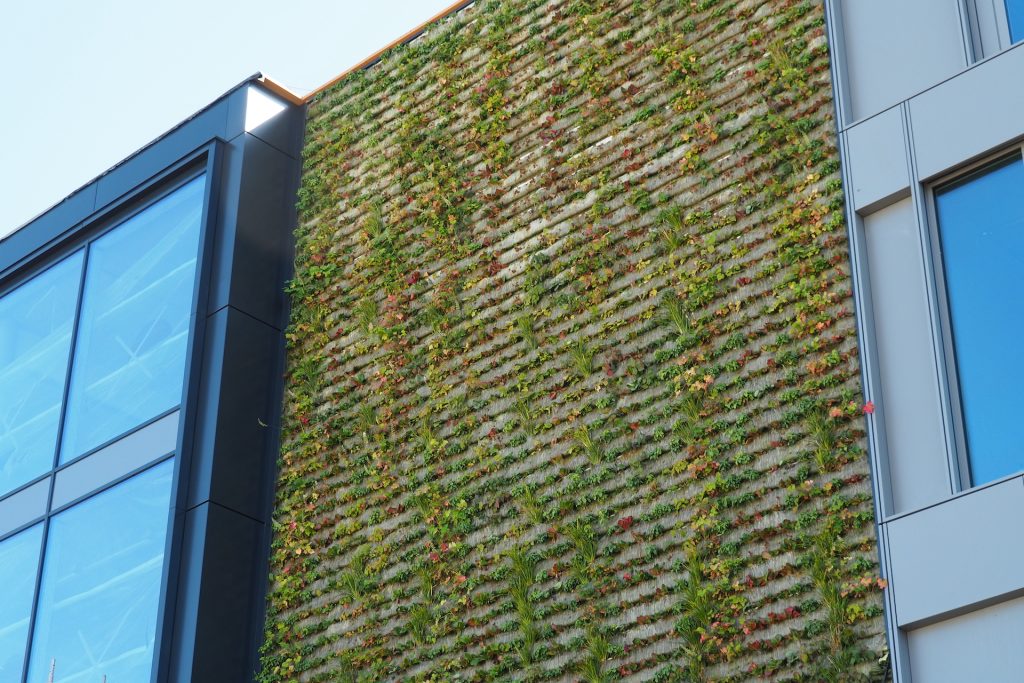 L’aspetto architettonico esterno mostra subito le sue credenziali: una facciata verde, progettata in collaborazione con la società Vertiko, copre più di 100 metri quadrati e ospita diverse specie di piante e insetti durante tutto l’anno. Si tratta di un giardino verticale, che filtra gli agenti inquinanti, isola il rumore del traffico e ha un impatto positivo sul microclima e sulla biodiversità.