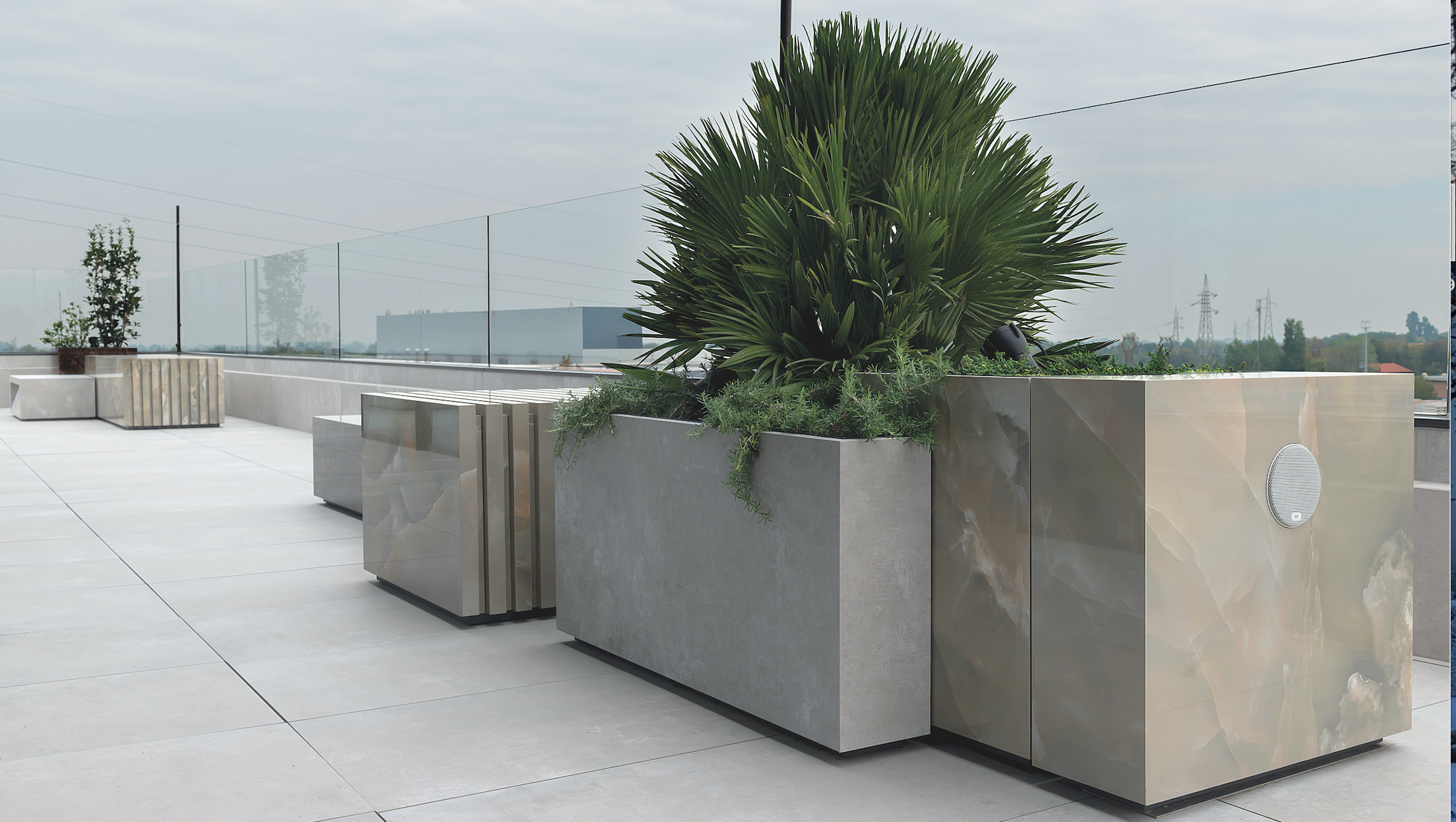La cucina outdoor con lavabo ed elementi modulari contenitivi è stata realizzata con le grandi lastre MaxFine nelle versioni Walk On ed Emperador. Elementi di arredo urbano e sedute multifunzione hand made, con casse sonore incorporate, sono rivestiti con la gamma MaxFine nelle texture Onice Giada, Walk On ed Emperador completando con funzionalità e ricerca estetica lo spazio esterno.