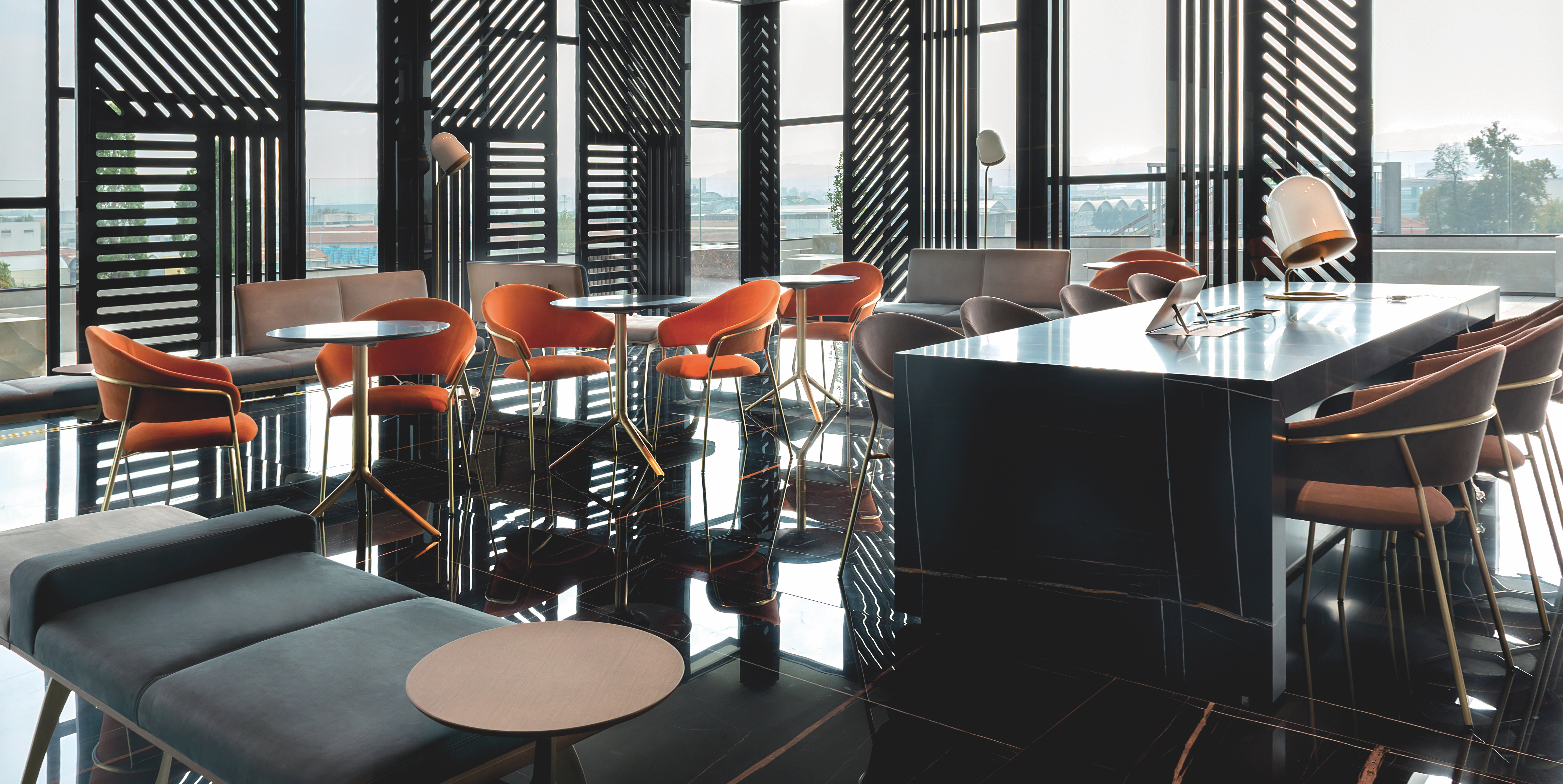 Nella zona lounge&meeting, il prodotto Onice Grigio si inserisce come un carpet ceramico ricco di cromie grigie venate di toni caldi e freddi all’interno di una porzione del pavimento, suggerendo possibili accostamenti materici con effetti a contrasto o tono su tono.