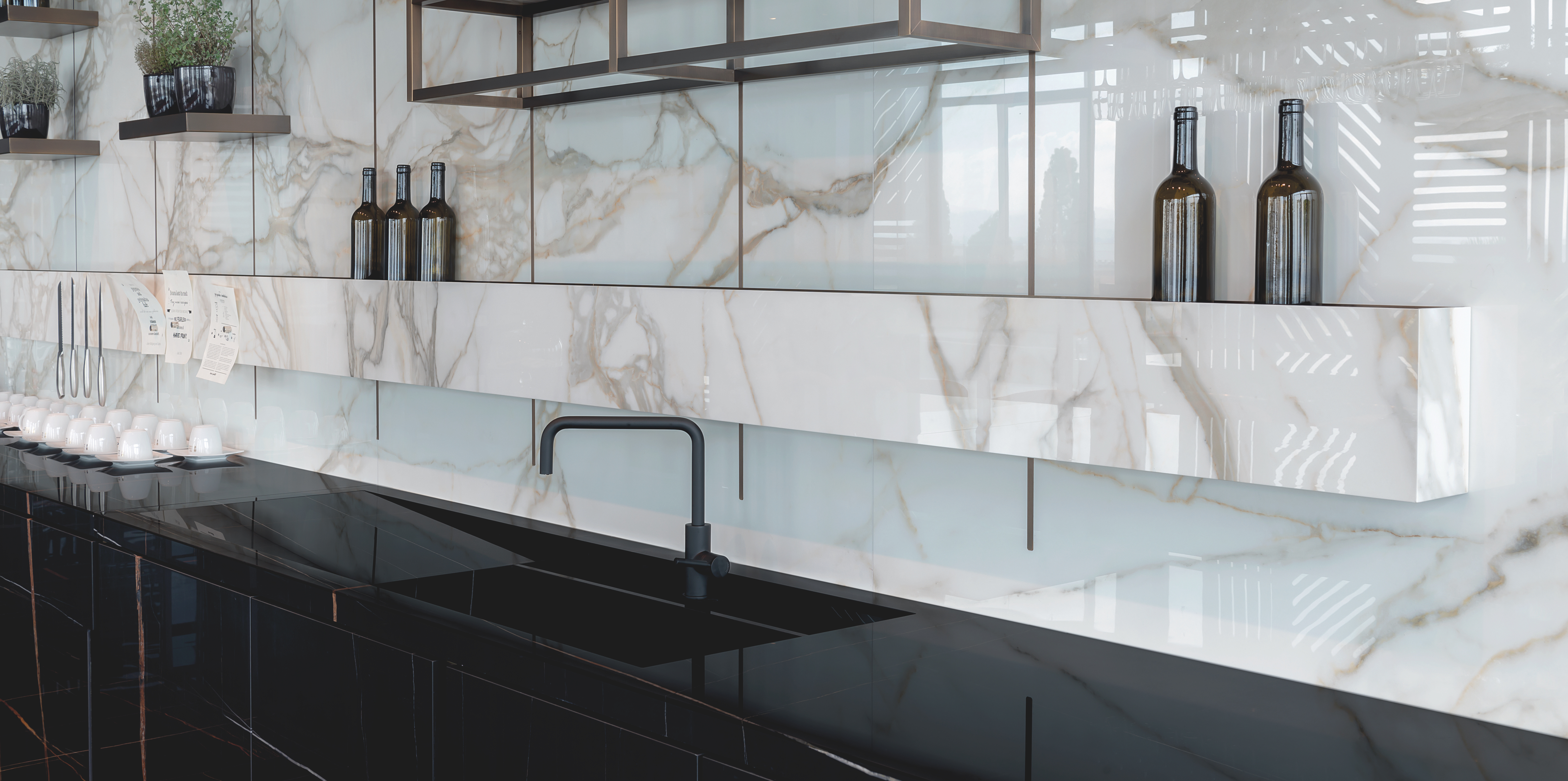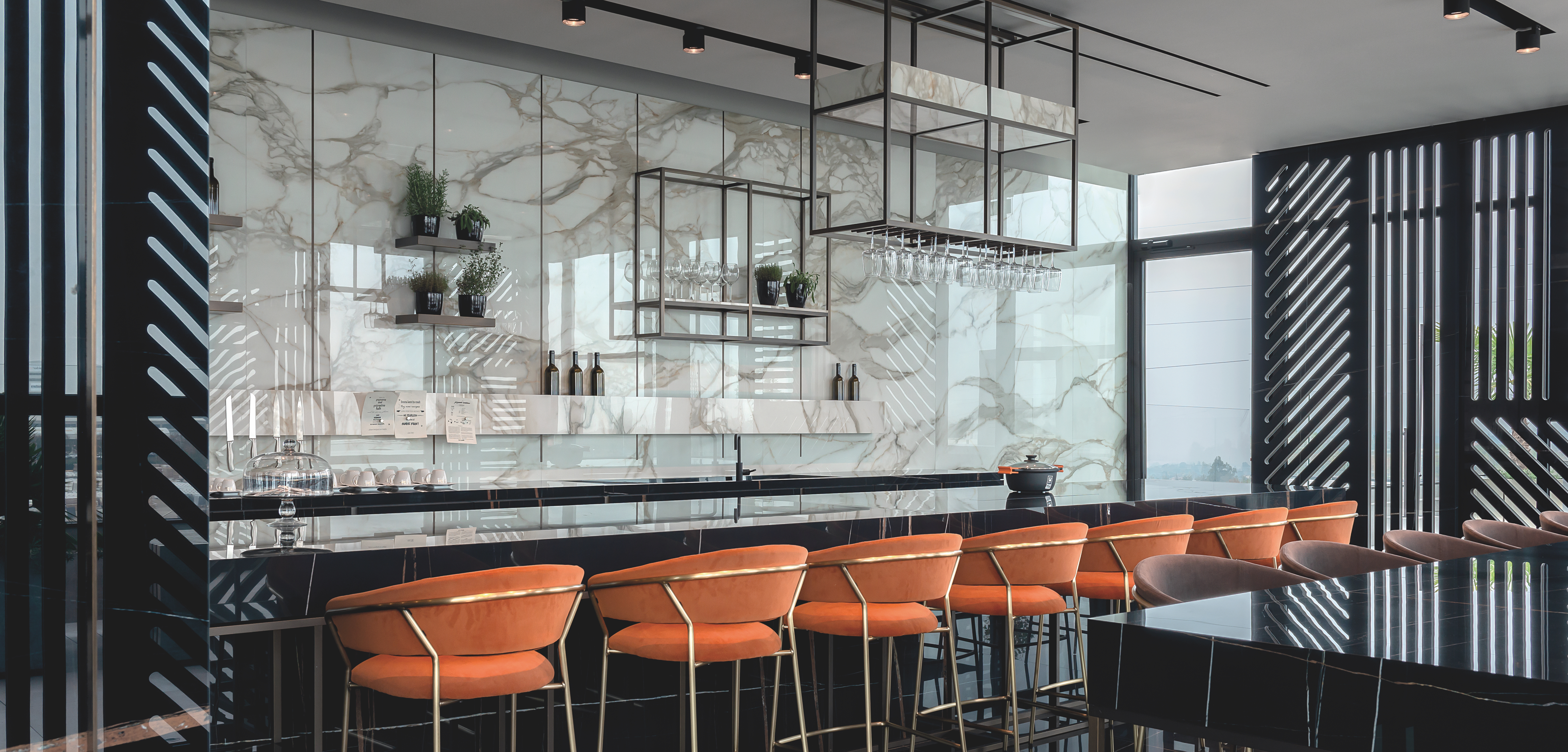 Nell’area bistrot, il banco della cucina è rivestito con lastre Sahara Noir ed entra in elegante contrasto con la raffinata texture Calacatta Oro della collezione Marmi MaxFine, che illumina l’ampia parete attrezzata con mensole e supporti, anch’essi in gres porcellanato.