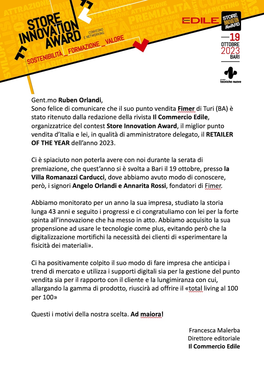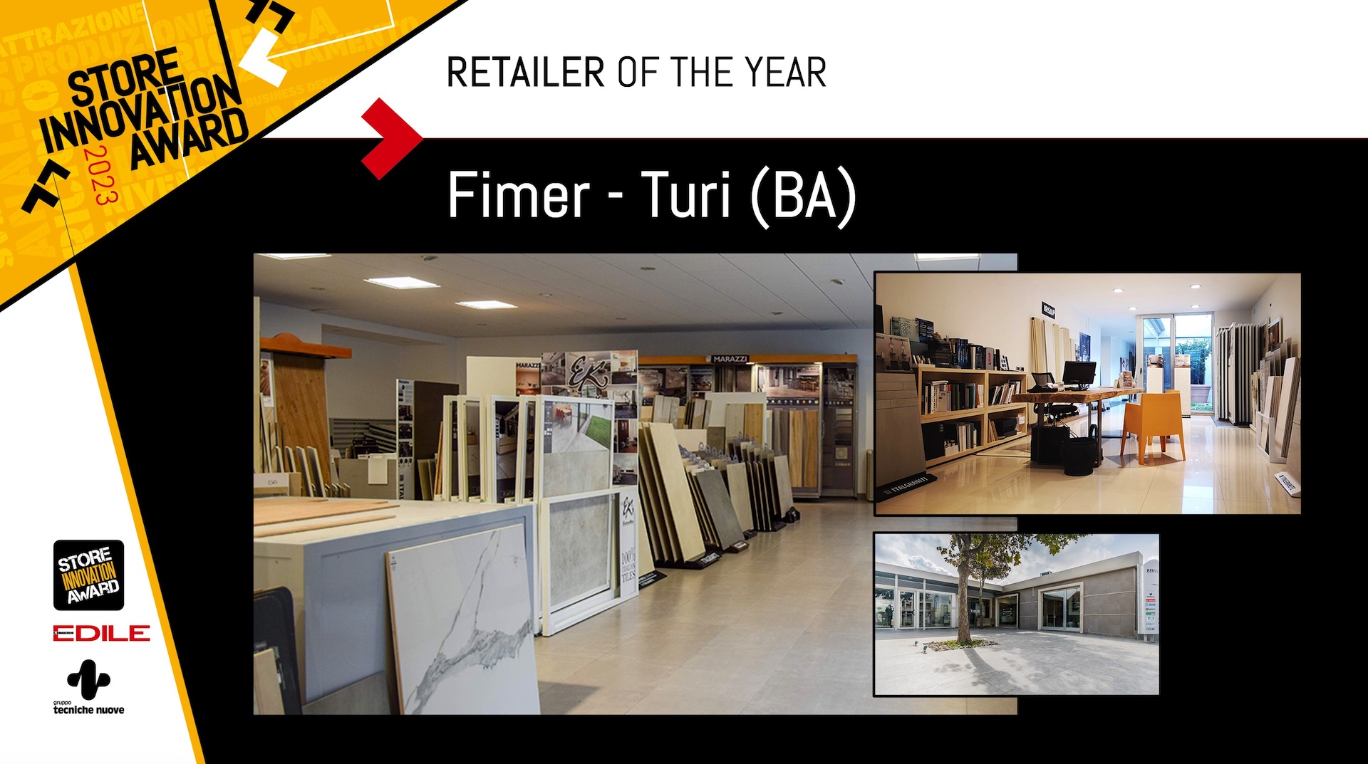 Sono felice di comunicare che il suo punto vendita Fimer di Turi (BA) è stato ritenuto dalla redazione della rivista Il Commercio Edile, organizzatrice del contest Store Innovation Award, il miglior punto vendita d’Italia e lei, in qualità di amministratore delegato, il RETAILER OF THE YEAR dell’anno 2023.