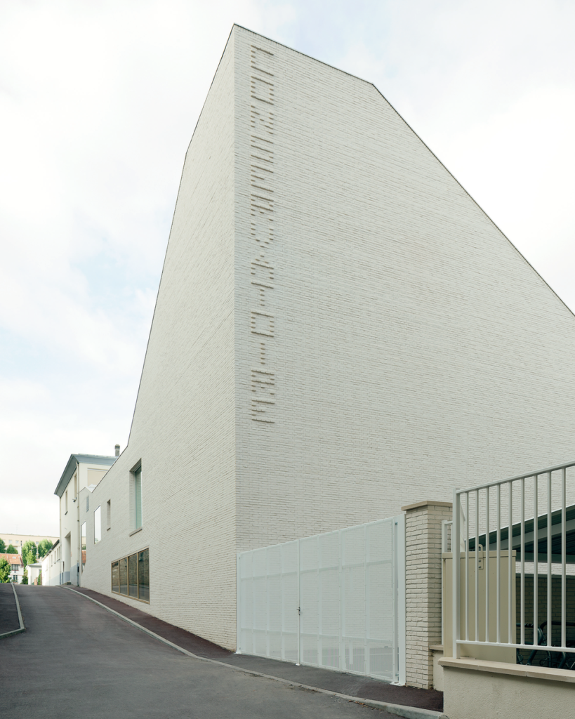 I mattoni sono apparecchiati in modi diversi sulle facciate: di fascia verso il cortile e sul retro, a blocco sul fronte sud svettante verso l’accesso pubblico. Qui, una serie di mattoni sporgenti di testa compone l’insegna «conservatoire» a indicare la destinazione dell’edificio. Il manto, in tegole smaltate bianche, riflette la luce mutevole durante la giornata, contribuendo all’effetto di una sagoma mossa, quasi danzante.