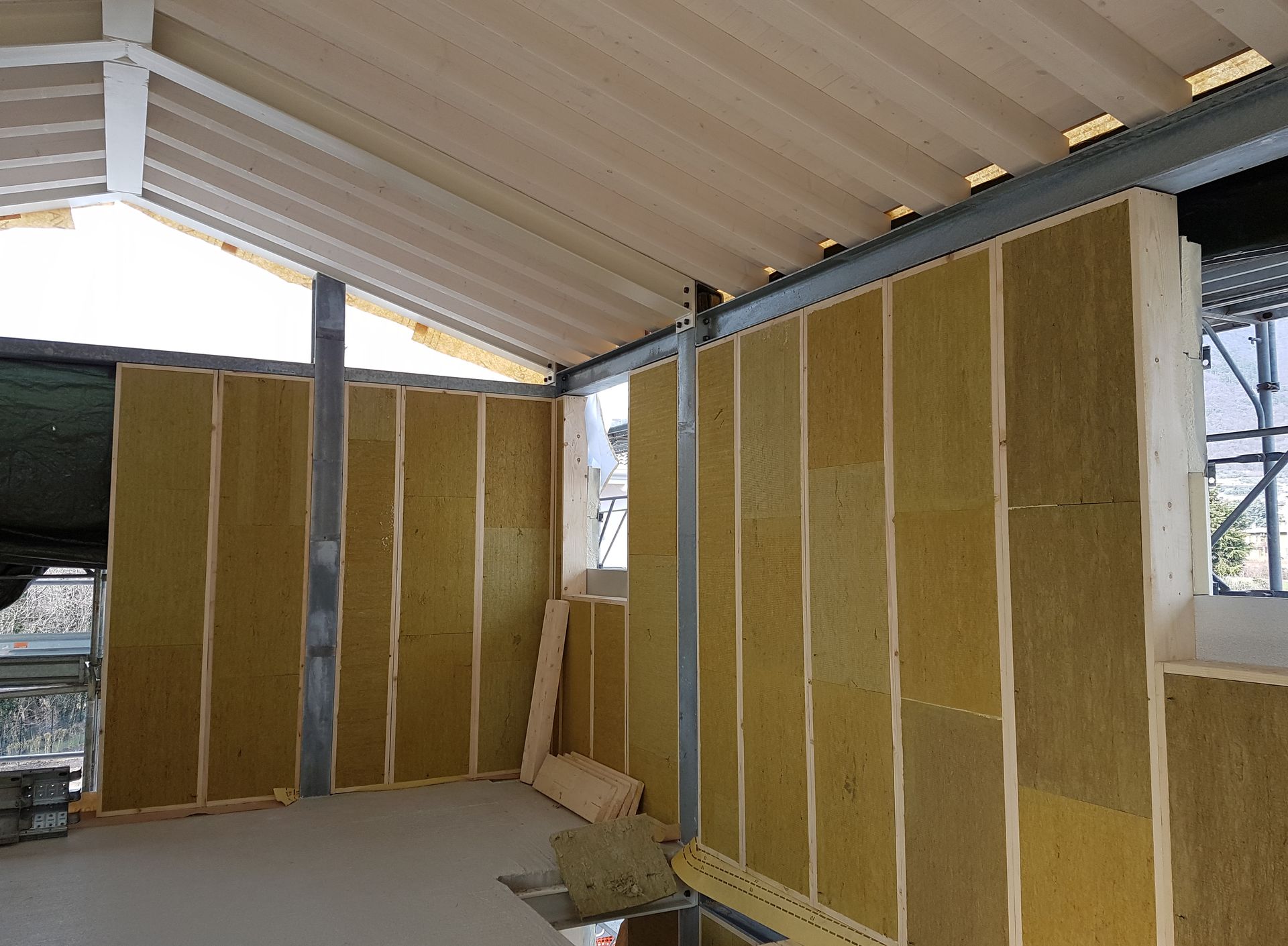 Gli involucri dei due edifici sono stati coibentati in modo continuo, impiegando lo stesso sistema Isotec Parete sia in facciata che in copertura. Per il rivestimento delle facciate è stata scelta una configurazione elegante con pannelli in fibrocemento, assicurati con semplici viti ai correntini di Isotec Parete, successivamente rasati a intonaco.