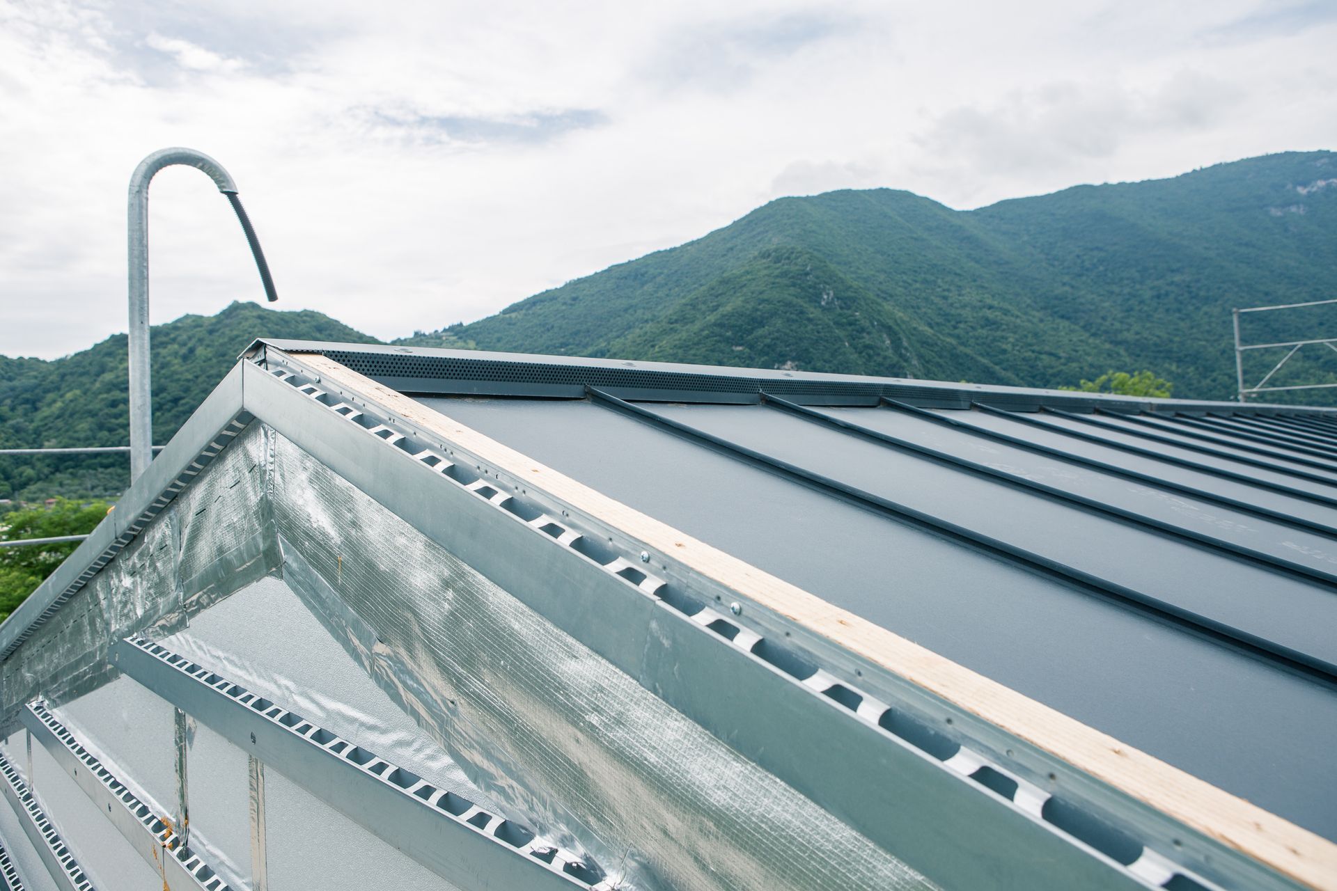 L’effetto finale, per i due edifici, è una brillante bicromia grigio-bianca. Per la copertura si è scelto lo stesso sistema isolante, poiché la particolare forma del correntino di Isotec Parete offriva una superficie di appoggio più ampia per il fissaggio del tavolato di Osb su cui è stata poi fissata la lamiera aggraffata, scelta per il rivestimento del tetto.